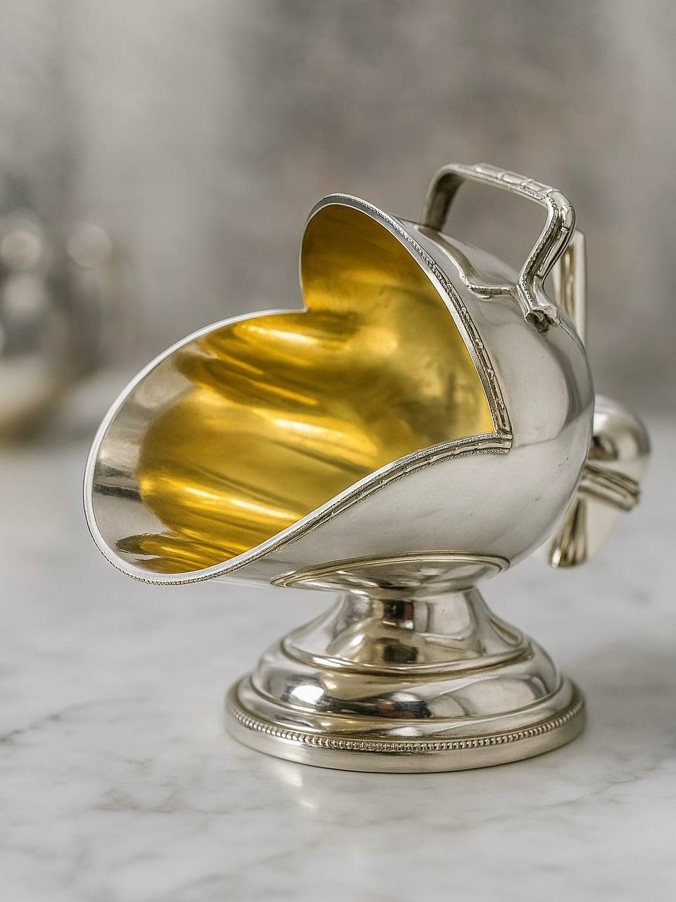 Представляем вашему вниманию настоящую жемчужину среди столовых аксессуаров — винтажную сахарницу в форме шлема с утонченным совочком. Это не просто предмет быта, а настоящий произведение искусства, способное украсить любую кухню или столовую. Изделие выполнено в изысканном винтажном стиле и изготовлено из качественного серебрения, что обеспечивает ему неповторимый блеск и долговечность.Сахарница обладает оригинальной формой, напоминающей шлем, что делает её центром внимания и придает особый характер. Ярко выраженные декоративные элементы четко выделяются на фоне изящных линий изделия, а практичный совочек позволяет удобно и аккуратно пользоваться сахарницей. Внутри она покрыта золотистым напылением, благодаря чему даже самые простые моменты чаепития превращаются в роскошный ритуал.Эта сахарница станет не только функциональным дополнением к вашему столу, но и отличным подарком на важные события в жизни ваших близких. Подарите себе и им это великолепие, которое подчеркнет высокий вкус и статус. Отметим, что винтажные аксессуары сейчас особенно в тренде, а подобные вещи становятся редкостью, и поэтому они так высоко ценятся коллекционерами и ценителями антиквариата.Спешите приобрести этот уникальный аксессуар и позвольте себе насладиться истинной роскошью прошлого, которая будет радовать не только своим видом, но и функциональностью в ежедневном использовании.