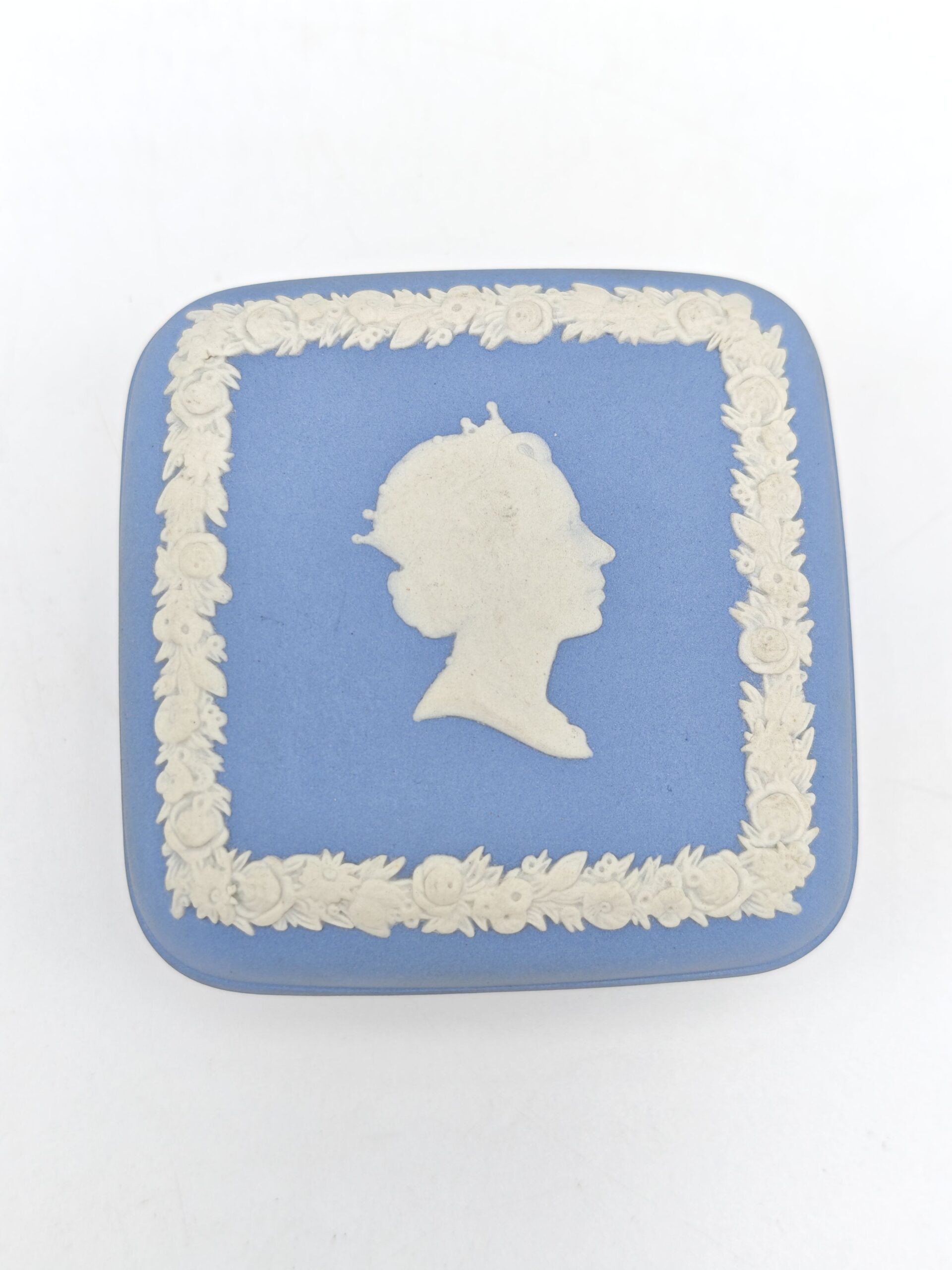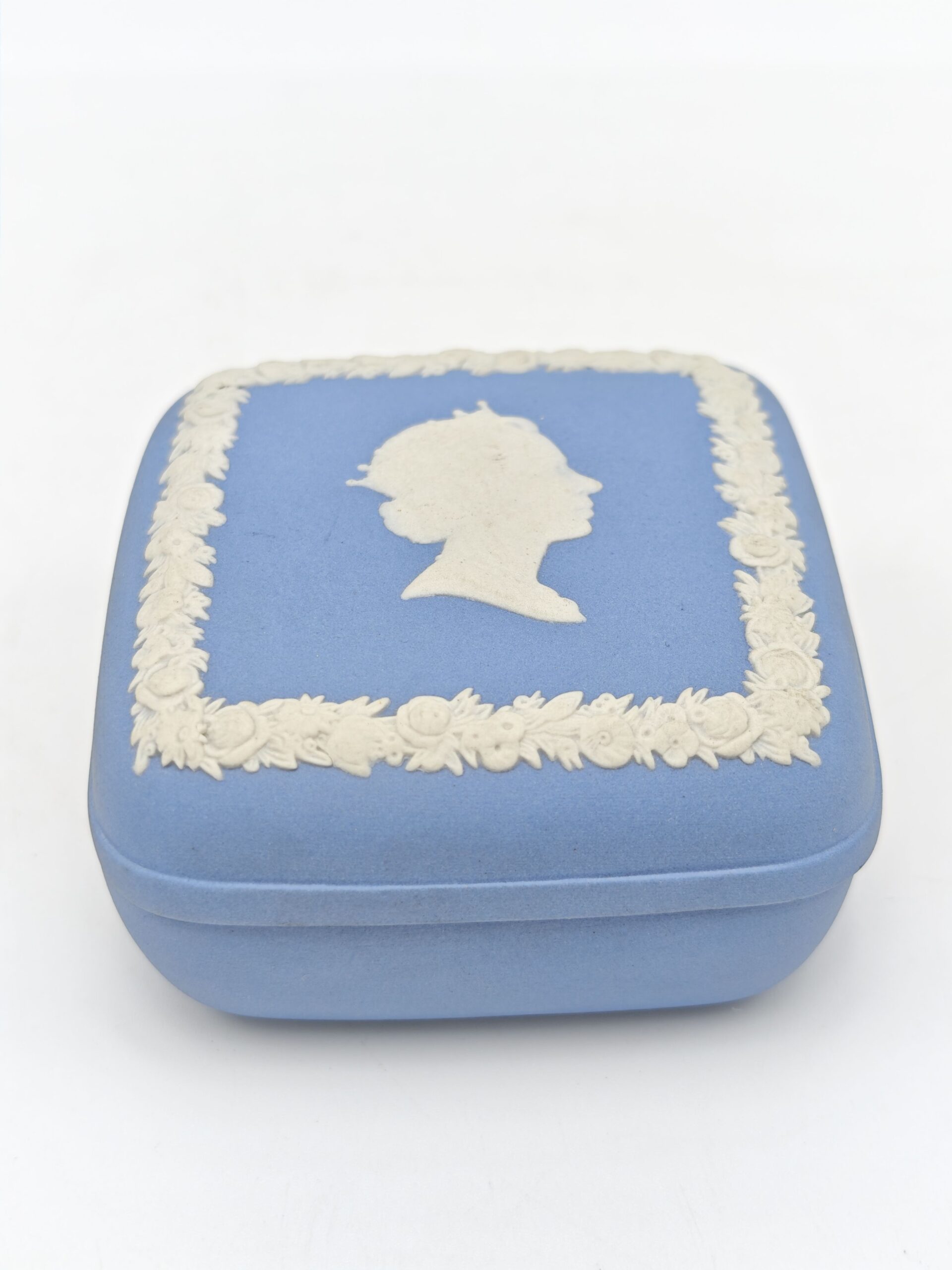 Винтажная шкатулка украшена рельефом белого цвета с профилем Елизаветы II. Выпуск к серебряной свадьбе.