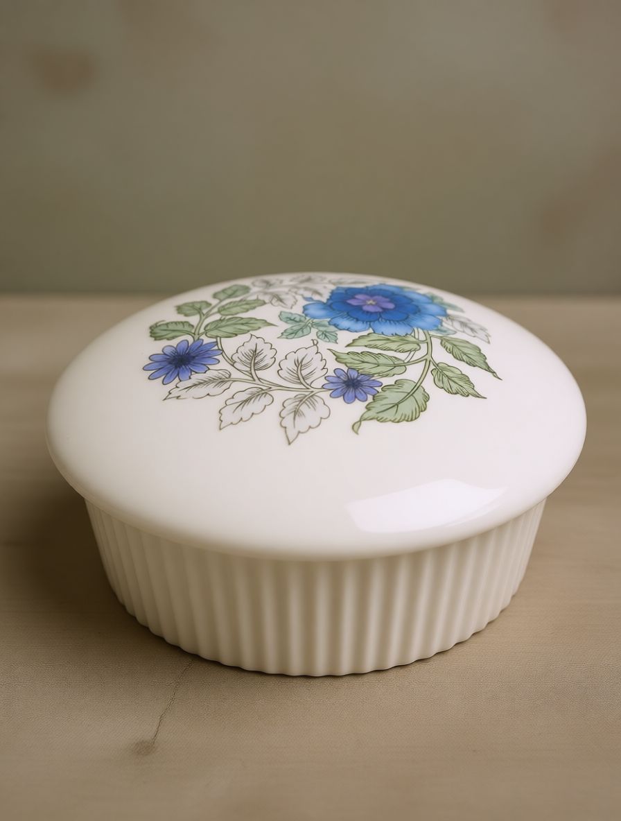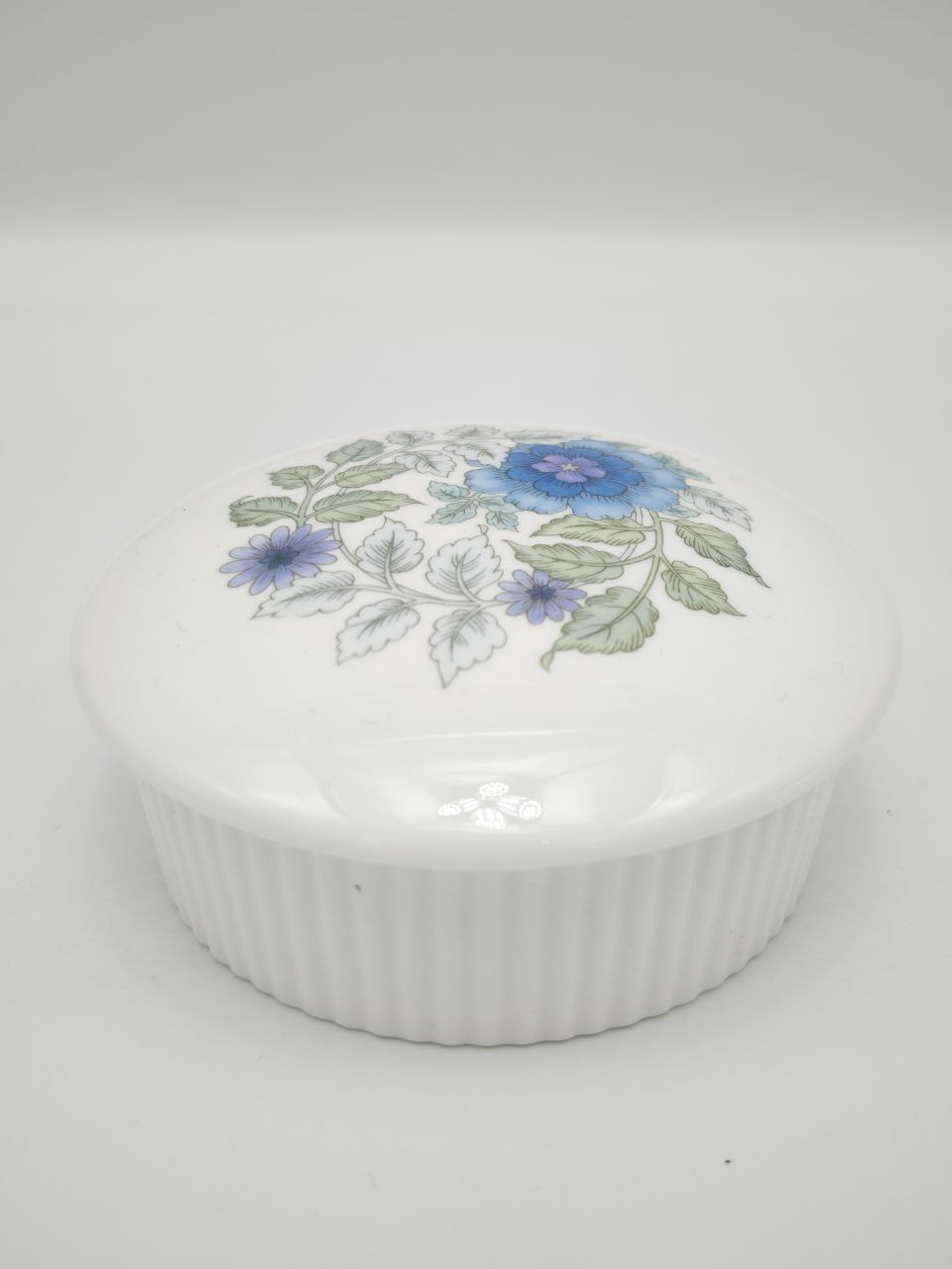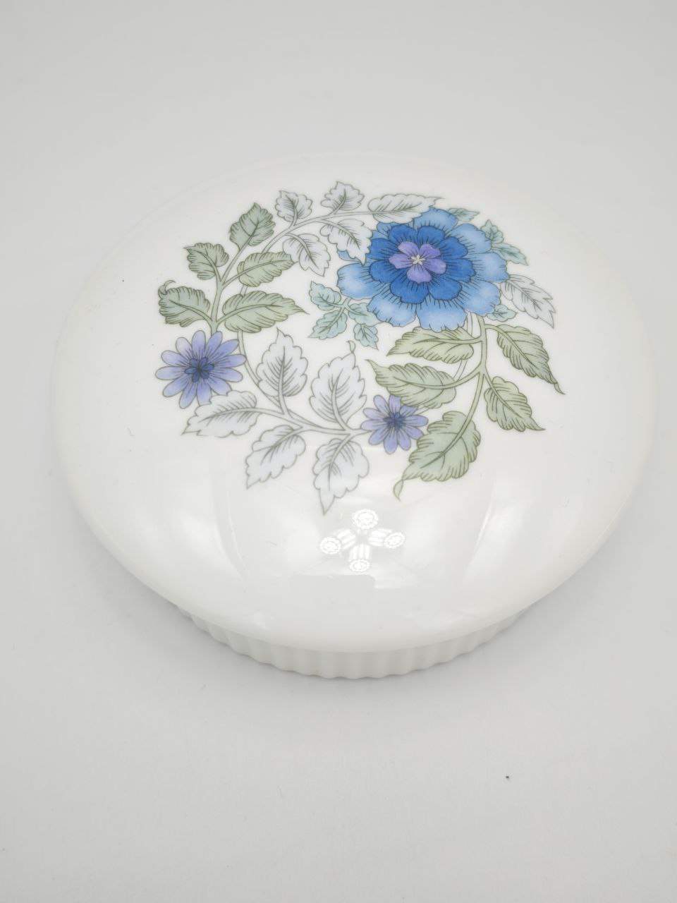 Представляем вашему вниманию редкую и изысканную винтажную шкатулку от легендарного бренда Wedgwood — настоящий шедевр английского фарфорового искусства. Это не просто функциональный предмет, а настоящее произведение декоративно-прикладного искусства, воплощающее вековые традиции мастерства и безупречного вкуса. Шкатулка изготовлена из высококачественного костяного фарфора, что придает ей неповторимую белизну, прозрачность и звонкость, свойственные только лучшим образцам. Ее форма — это классический круглый силуэт с удобной крышкой, которая плотно закрывается, и основанием с вертикальными ребрами, придающими изделию текстуру и тактильную привлекательность.Декор шкатулки выполнен вручную с невероятной точностью и вниманием к деталям. На поверхности крышки раскинулся элегантный цветочный орнамент, где яркие синие и лавандовые цветы, возможно, гортензии или анемоны, гармонично переплетаются с нежными зелеными листьями и стеблями. Каждый элемент рисунка проработан до мельчайших штрихов, создавая ощущение живой природы, застывшей на белоснежной поверхности фарфора. Цветовая палитра — спокойная и благородная, с акцентом на холодных тонах — идеально подходит для создания атмосферы уюта и элегантности в любом помещении.На дне шкатулки вы найдете фирменный клеймо Wedgwood с изображением амфоры, а также надпись “Bone China” и “MADE IN ENGLAND”, что подтверждает ее подлинность и происхождение. Это не просто маркировка — это история, свидетельство того, что ваша шкатулка была создана в Англии, в одном из самых знаменитых фарфоровых заводов мира, чья репутация строилась на веках безупречного качества и изысканного вкуса.Такая шкатулка станет идеальным решением для хранения ювелирных украшений, колец, серег, брошек или других мелочей на туалетном столике, в спальне или на полке в гостиной. Она прекрасно дополнит собой коллекцию антиквариата или станет роскошным подарком для ценителя изящных вещей. Шкатулка не требует особого ухода, но ее стоит беречь от ударов и резких перепадов температур, чтобы сохранить первозданную красоту на долгие годы. Приобретая эту шкатулку, вы не просто покупаете предмет декора — вы становитесь обладателем части истории, кусочка английской культуры и искусства, которое будет радовать глаз и восхищать гостей на протяжении многих поколений.