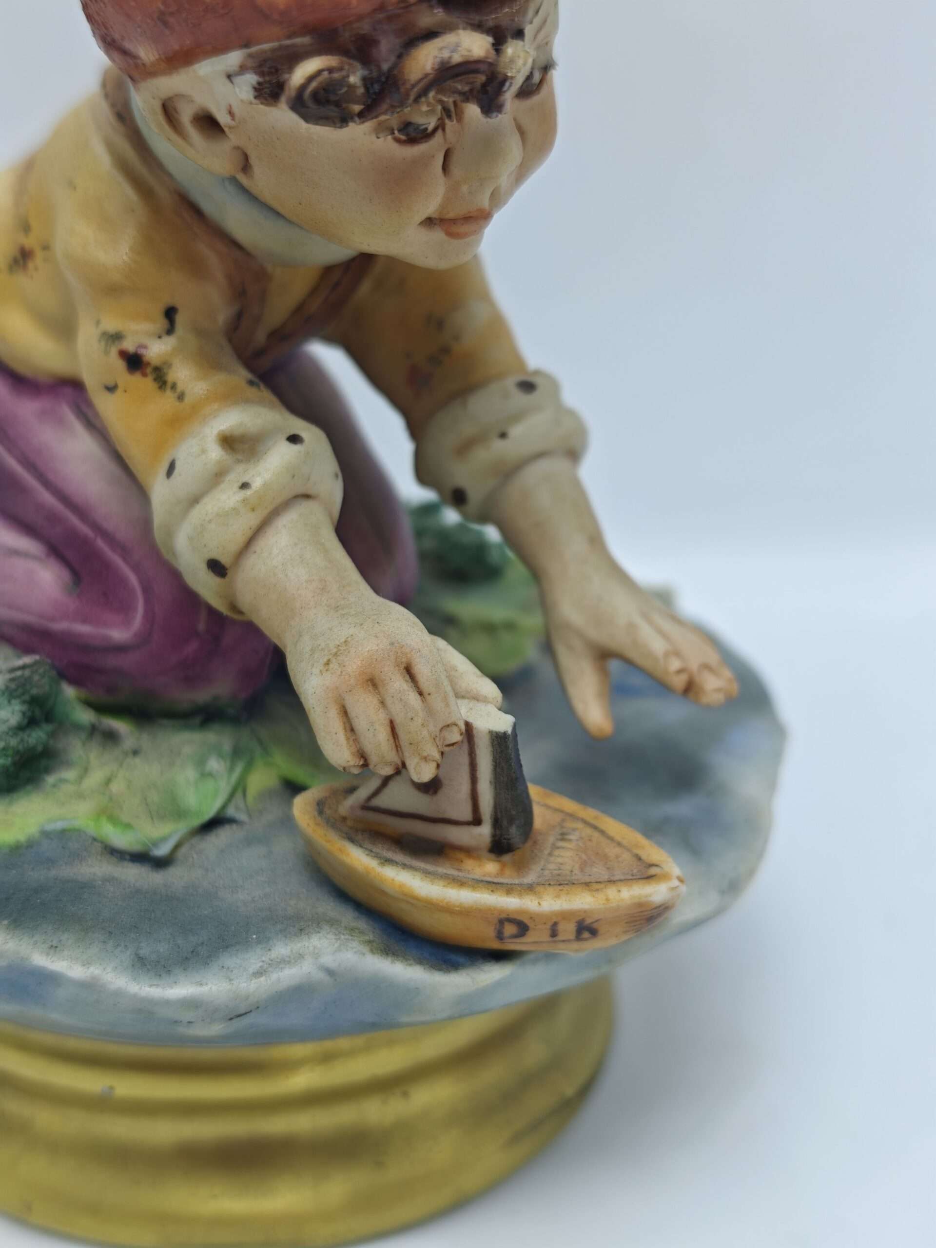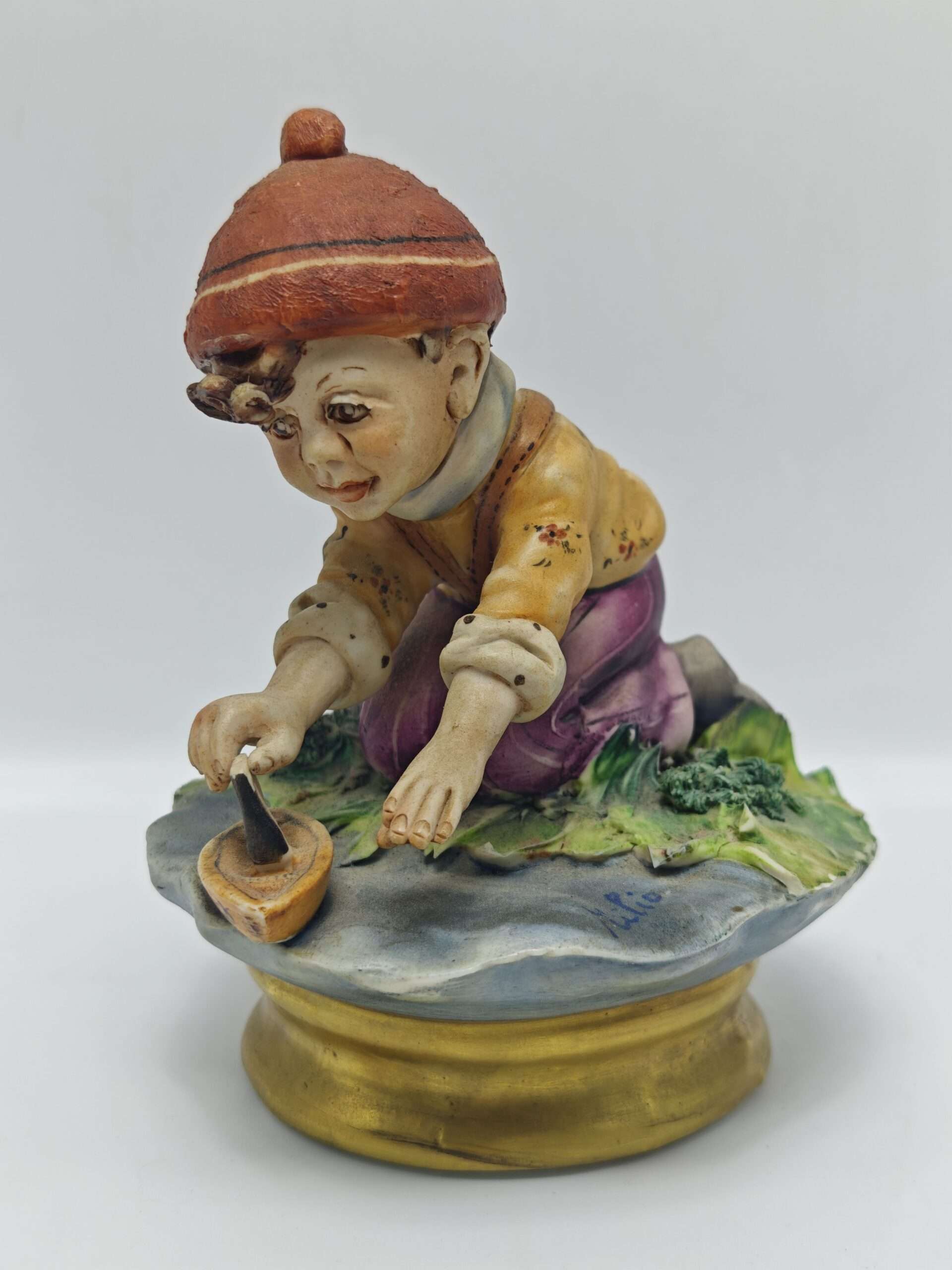 Винтажная статуэтка от знаменитой фарфоровой мануфактуры Каподимонте (Capodimonte). Создана из оригинального костяного фарфора. Произведена и раскрашена вручную художником Милио (Milio). Подпись автора на основой части фигурки, клеймо мануфактуры на дне. Статуэтка изображает мальчика, который запускает кораблик.