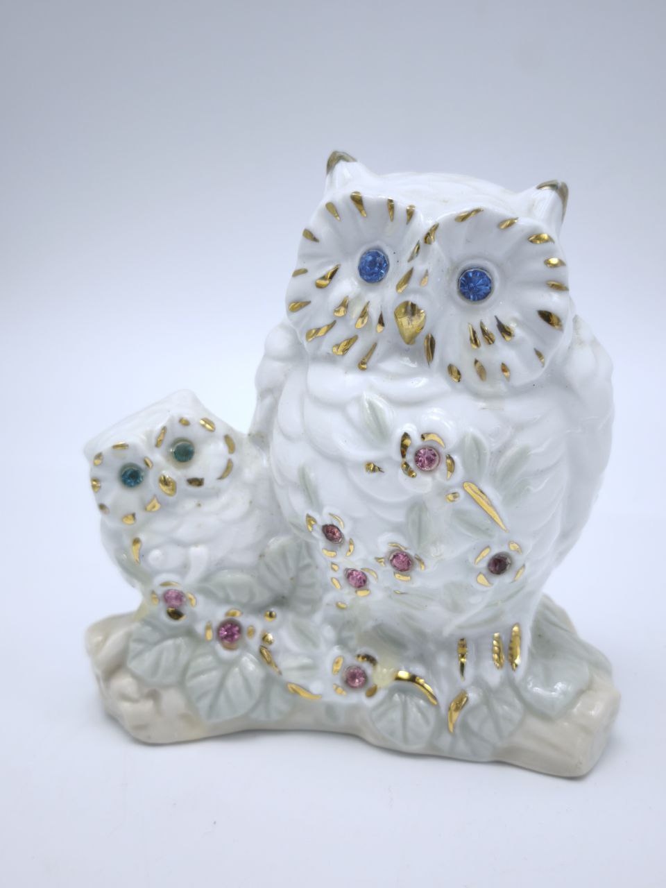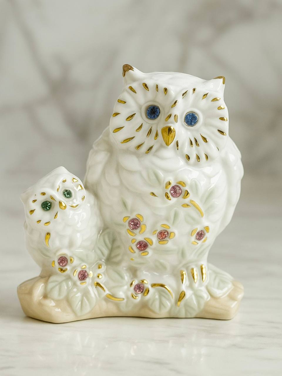 Винтажная фарфоровая статуэтка совиной семьи — это уникальное изделие, которое объединяет в себе изящество, символизм и великолепие классического искусства. Выполненная из высококачественного материала, эта статуэтка изображает двух сов — взрослую и совенка, которые сидят вместе в окружении изящных цветов и листьев. Нежные пастельные оттенки, украшенные золотыми акцентами, создают утонченную и гармоничную композицию, которая покоряет с первого взгляда.Эта фарфоровая фигурка отличается исключительной детализацией: каждая линия, перышко и декоративный элемент продуманы до мелочей. Глаза сов украшены яркими ювелирными камнями, которые переливаются на свету и добавляют изделию особого шарма. Золотые детали, украшающие перья, клювы и контуры цветов, придают статуэтке благородство и винтажную утонченность.Кроме своего декоративного значения, изображение сов обладает глубоким символическим смыслом. Сова считается символом мудрости, знаний и интуиции, а сцена с совенком добавляет элемент семейного тепла, заботы и любви. Эта статуэтка несет в себе особую энергетику, делая ее идеальным подарком для дорогого человека или ярким акцентом в интерьере вашего дома.Элегантная и компактная фигура легко впишется в любой интерьерный стиль: классический, винтажный или даже современный. Она займет достойное место на полке с книгами, в витрине с коллекционными предметами или на вашем рабочем столе, вдохновляя и принося радость каждый день.Эта статуэтка станет восхитительным подарком для коллекционеров фарфоровых изделий, любителей сов или тех, кто ценит винтажные декоративные элементы. Её оригинальный дизайн и душевное исполнение делают её универсальным вариантом как для личного использования, так и для праздничного сюрприза. Пусть эта изысканная совиная семейка наполнит ваш дом уютом, символизируя тепло, гармонию и мудрость.