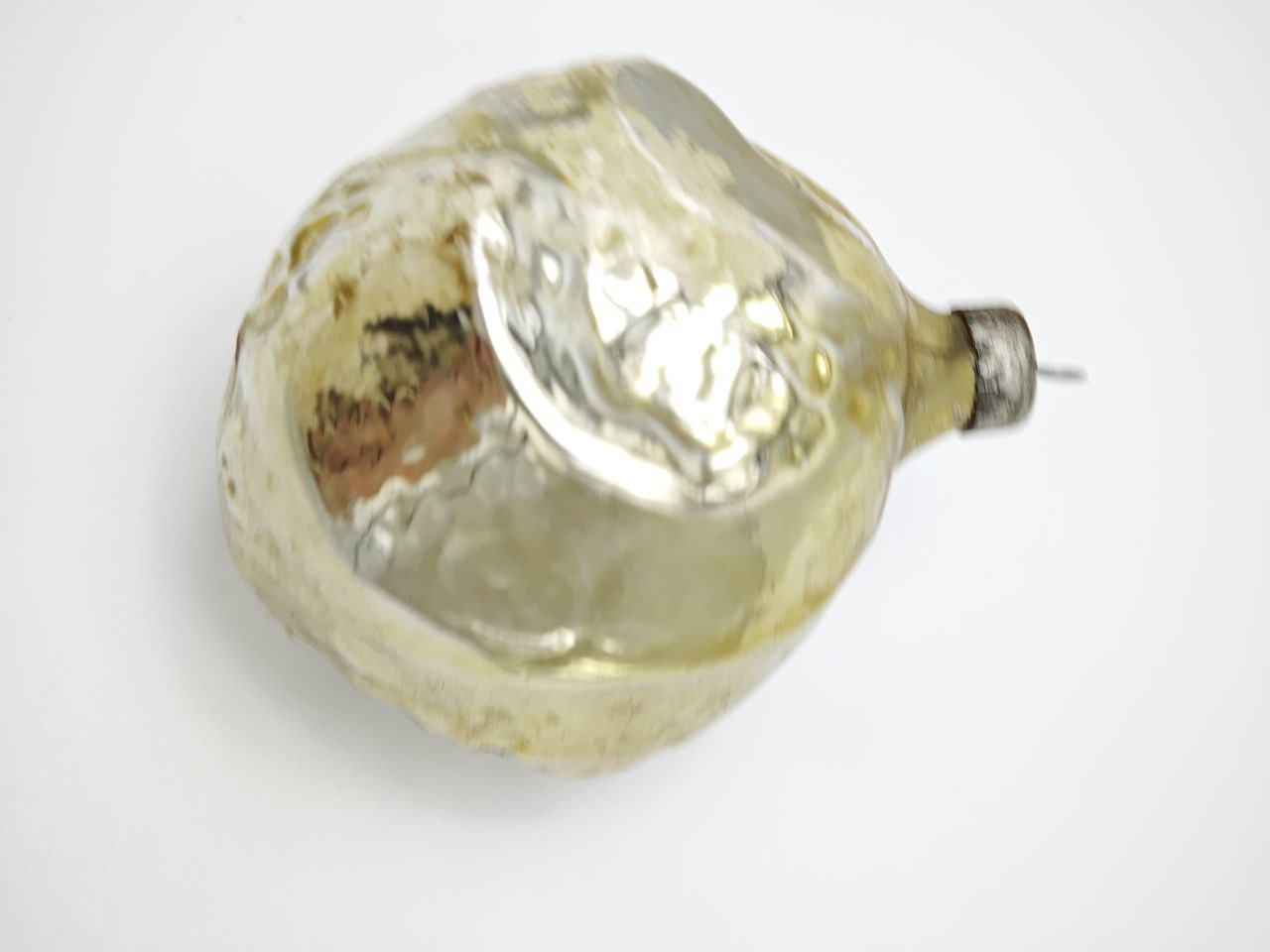 Ее асимметричная форма, с легкими вмятинами и неровностями, подчеркивает ручную работу, а потрескавшееся напыление — следы времени, которые делают ее уникальной. Когда вы повесите ее на елку, она станет фокусом: серебристые блики будут переливаться в свете гирлянд, словно отражая лунный свет, а патина добавит глубину, напоминая, что прошлое всегда рядом. Эта игрушка подойдет как для классической елки с винтажными гирляндами, так и для современного интерьера — ее необычная форма и аутентичность создадут ощущение, что вы держите в руках кусочек истории.