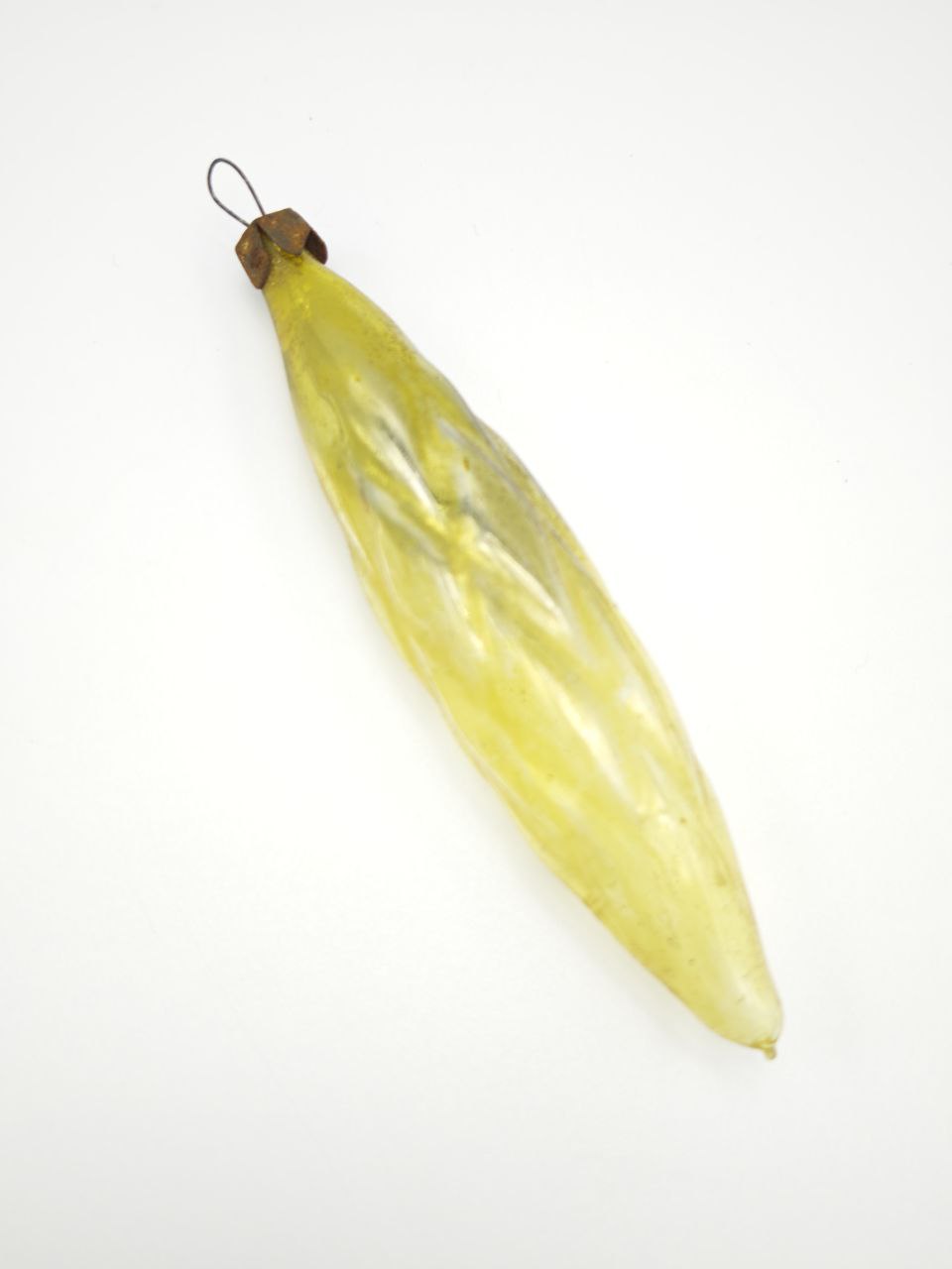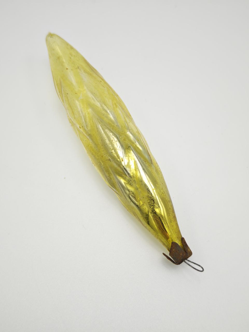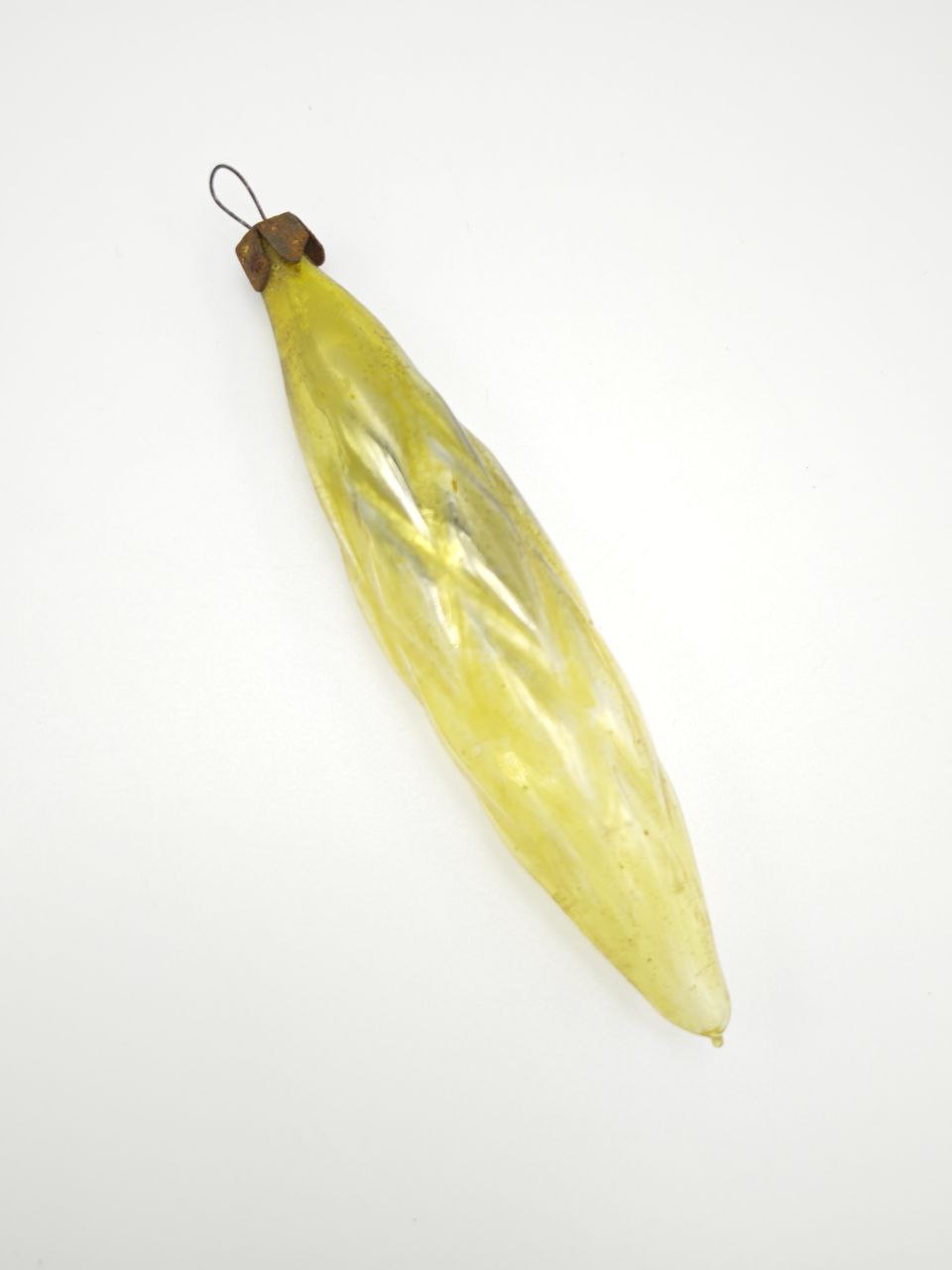 Погрузитесь в волшебство прошлого с этой уникальной винтажной стеклянной елочной игрушкой, рожденной в эпоху, когда каждая деталь создавалась с душой. Ее нежно-желтый оттенок, словно застывший солнечный луч, пронизан тонкими внутренними прожилками, напоминающими капли росы на листе, которые при свете создают завораживающую игру бликов. Форма игрушки, напоминающая изящную каплю или лист, символизирует связь с природой и вечное движение времени — каждый поворот в руках открывает новые грани ее хрустальной текстуры. Верхняя часть украшена патинированным металлическим креплением, сохранившим следы времени в виде едва уловимой ржавчины, что подчеркивает подлинную историю этого артефакта. Это не просто украшение — это живой свидетель эпохи 1950-х, когда после военных лет семьи вновь обретали тепло праздников, а мастера вкладывали в каждую игрушку частичку надежды.