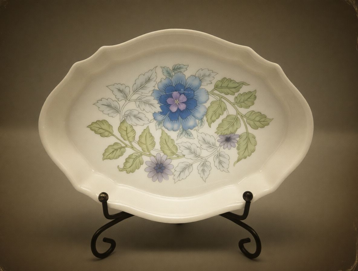 Представляем вашему вниманию редкую и изысканную винтажную тарелочку от легендарного бренда Wedgwood, коллекция “Clementine”. Это не просто функциональный предмет, а настоящее произведение искусства, воплощающее вековые традиции английского фарфорового мастерства. Тарелочка изготовлена из высококачественного костяного фарфора, что придает ей неповторимую белизну, прозрачность и звонкость, свойственные только лучшим образцам. Ее форма — это овальный силуэт с изящно волнистым краем, который придает изделию нежность и романтичность, идеально подходящие для хранения драгоценностей или как самостоятельный элемент декора.Декор тарелочки выполнен вручную с невероятной точностью и вниманием к деталям. В центре ее поверхности раскинулся элегантный цветочный орнамент, где яркие синие и лавандовые цветы, возможно, гортензии или анемоны, гармонично переплетаются с нежными зелеными листьями и стеблями. Каждый элемент рисунка проработан до мельчайших штрихов, создавая ощущение живой природы, застывшей на белоснежной поверхности фарфора. Цветовая палитра — спокойная и благородная, с акцентом на холодных тонах — идеально подходит для создания атмосферы уюта и элегантности в любом помещении.На дне тарелочки вы найдете фирменный клеймо Wedgwood с изображением амфоры, а также надпись “Bone China”, “MADE IN ENGLAND” и название коллекции “CLEMENTINE”, что подтверждает ее подлинность и происхождение. Это не просто маркировка — это история, свидетельство того, что ваша тарелочка была создана в Англии, в одном из самых знаменитых фарфоровых заводов мира, чья репутация строилась на веках безупречного качества и изысканного вкуса.Такая тарелочка станет идеальным решением для хранения ювелирных украшений, колец, серег или других мелочей на туалетном столике, в спальне или на полке в гостиной. Она прекрасно дополнит собой коллекцию антиквариата или станет роскошным подарком для ценителя изящных вещей. Тарелочка не требует особого ухода, но ее стоит беречь от ударов и резких перепадов температур, чтобы сохранить первозданную красоту на долгие годы. Приобретая эту тарелочку, вы не просто покупаете предмет декора — вы становитесь обладателем части истории, кусочка английской культуры и искусства, которое будет радовать глаз и восхищать гостей на протяжении многих поколений.