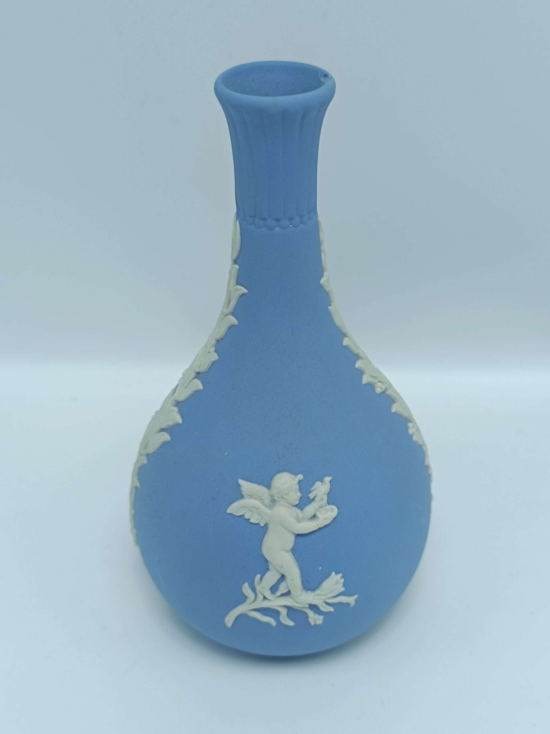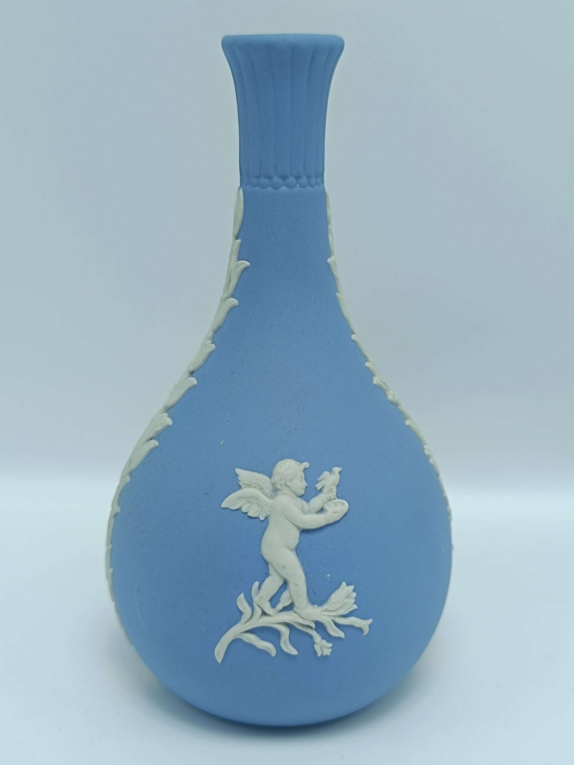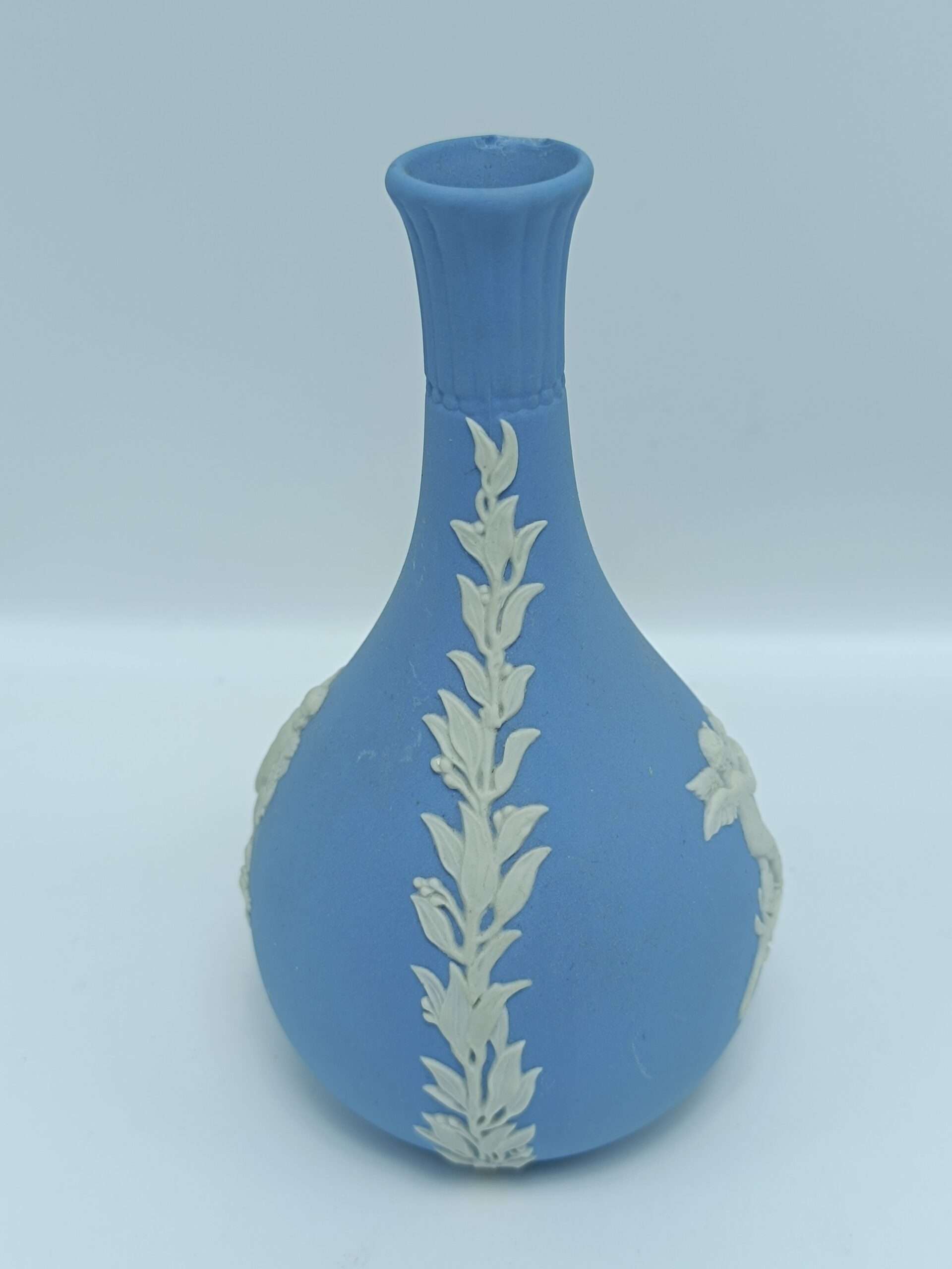 Элегантная нежно-голубая ваза из бисквитного фарфора. Произведена в середине 20 века фирмой Wedgwood в Англии. Матовый нежно-голубой цвет вазочки изысканно оформлен белоснежными узорами древнегреческих сцен. На дне клеймо от производителя.