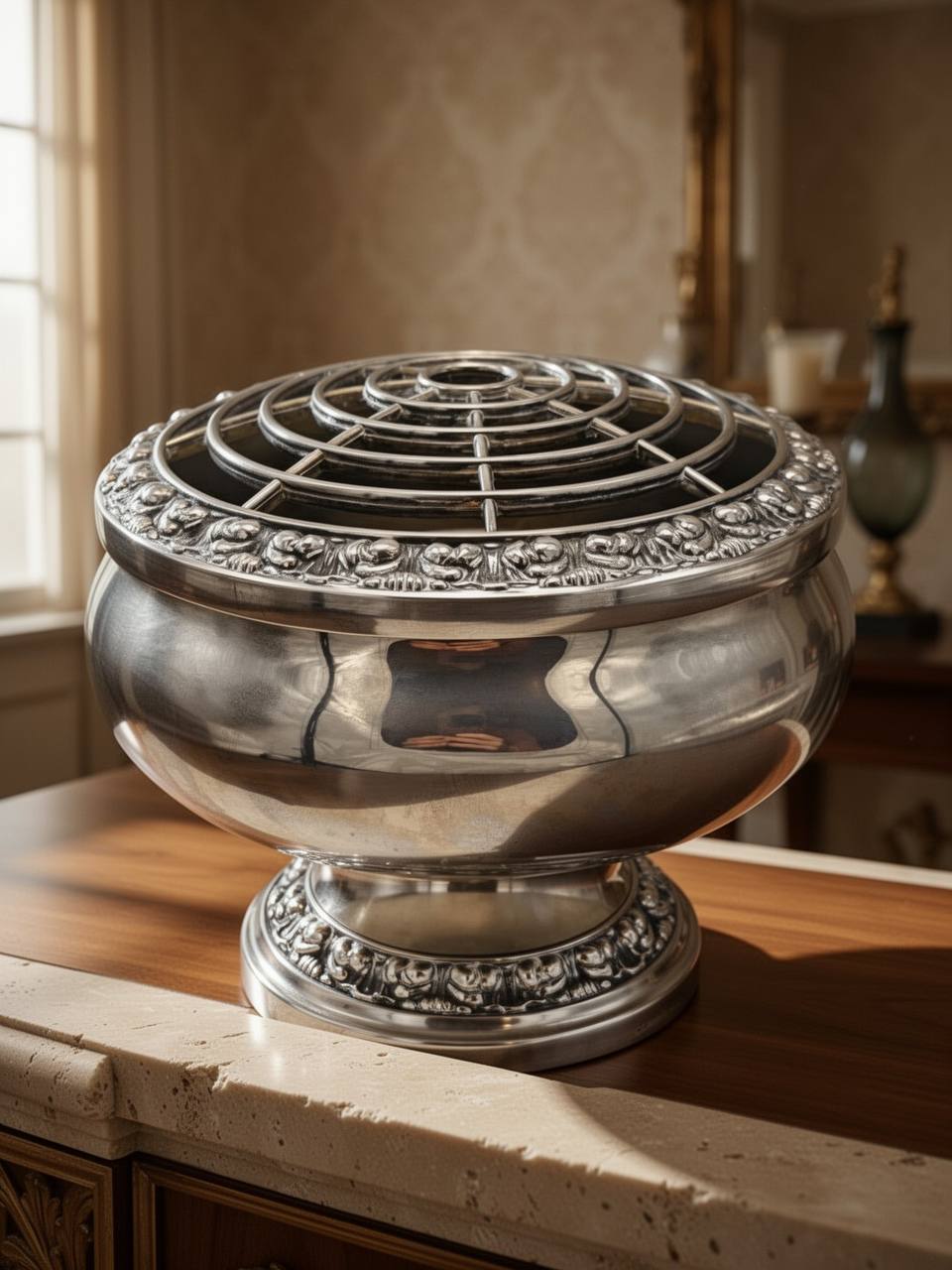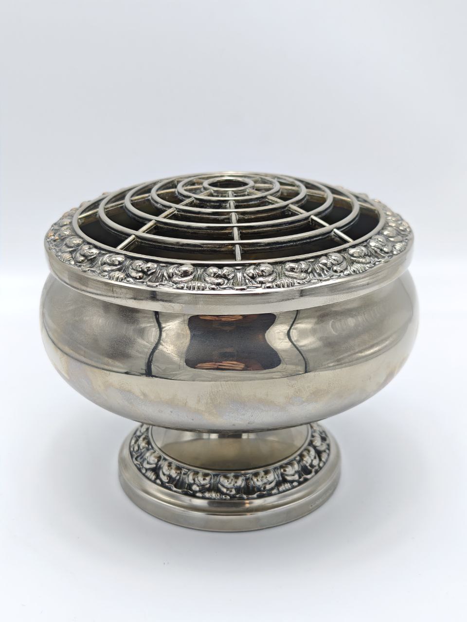 Элегантная винтажная ваза Rose Bowl английского производства — классическая форма для создания аккуратных цветочных композиций. Металлический корпус с серебрением украшен рельефным орнаментом по верхнему краю и основанию. Изделие установлено на устойчивой ножке, благодаря чему выглядит выразительно и гармонично в интерьере. Верхняя круговая решётка позволяет красиво распределить бутоны и фиксировать стебли, создавая аккуратную композицию без дополнительных держателей. Маркировка Silver Plated Made in England подтверждает происхождение изделия. Состояние очень хорошее. Предмет аккуратный, с естественными минимальными следами времени.