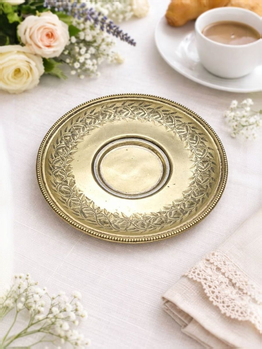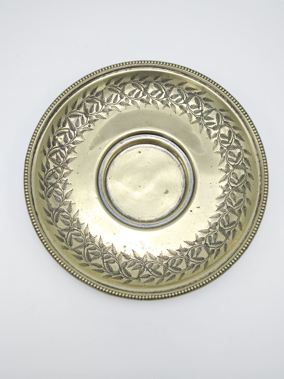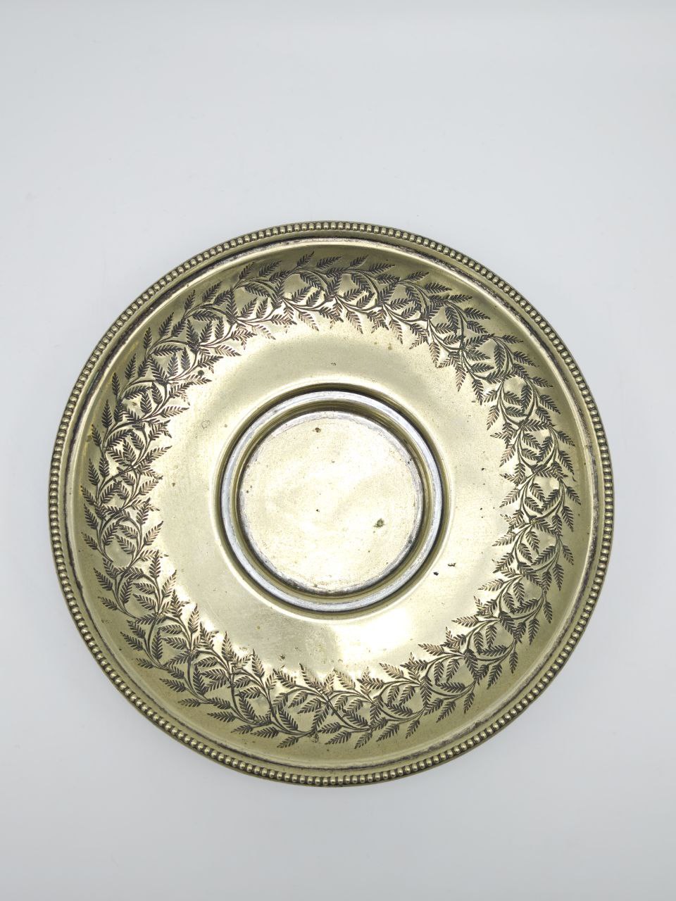 Изящная винтажная вазочка на ножке из латуни с посеребрением и тонкой гравировкой — элегантный акцент для классической сервировки стола и винтажного интерьера.