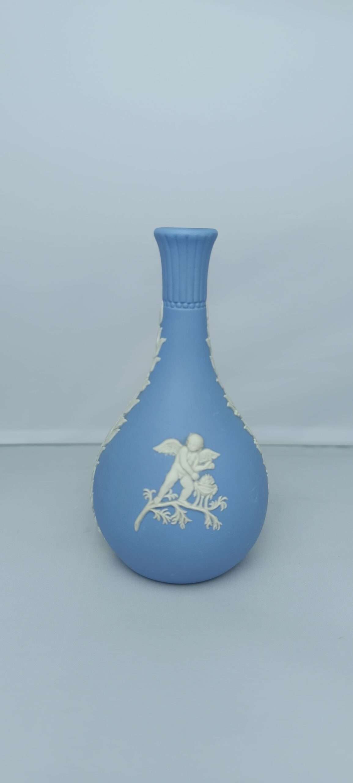 Элегантная нежно-голубая ваза из бисквитного фарфора. Произведена в середине 20 века фирмой Wedgwood в Англии. Матовый нежно-голубой цвет вазочки изысканно оформлен белоснежными узорами древнегреческих сцен. На дне клеймо от производителя.