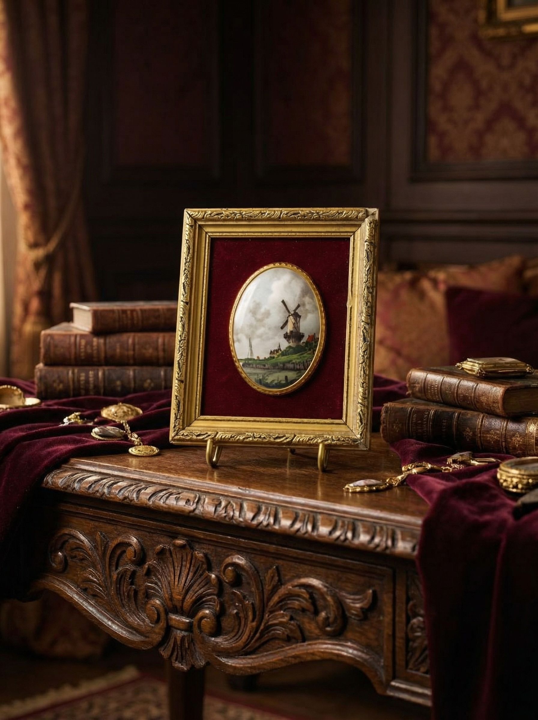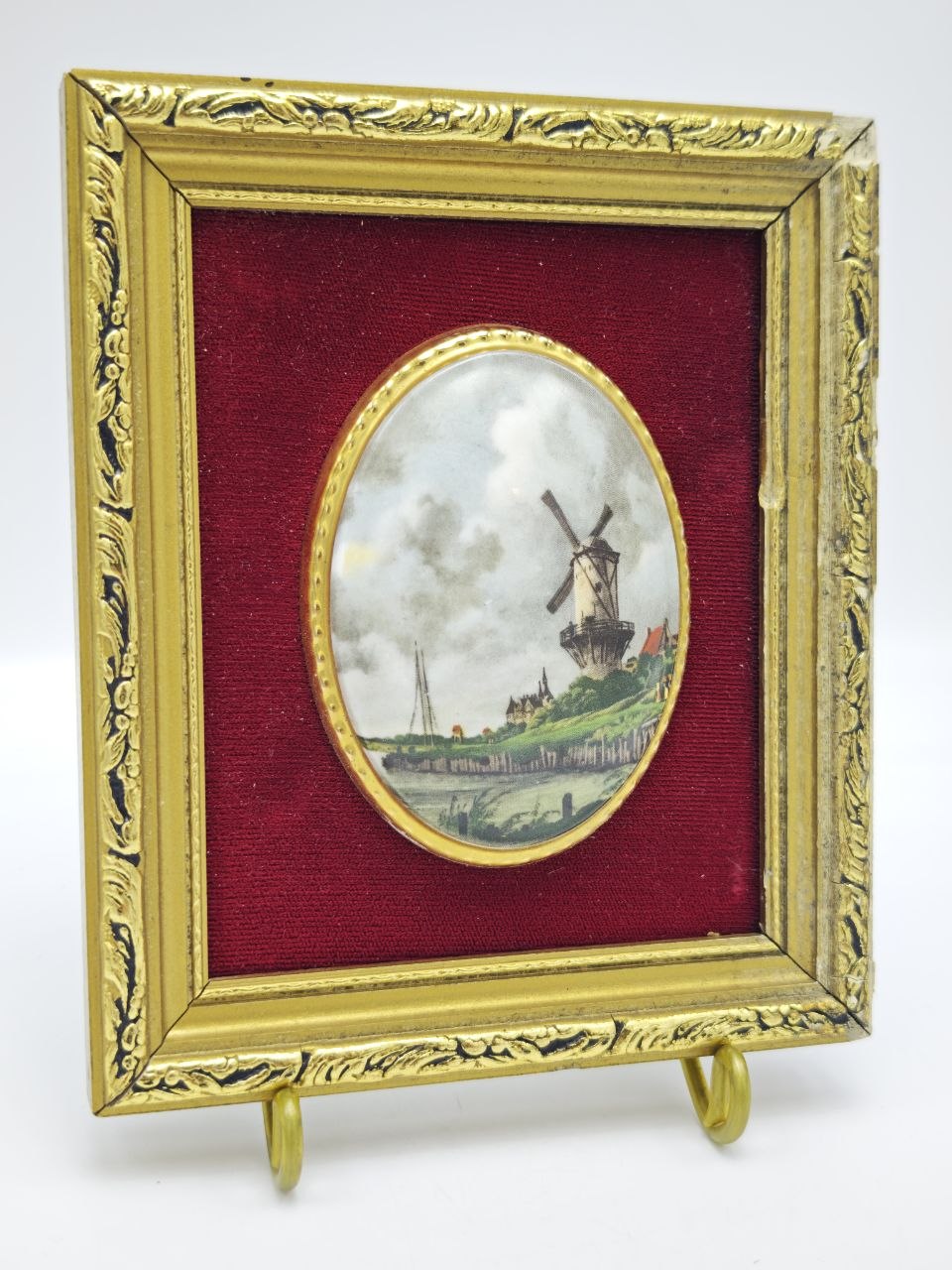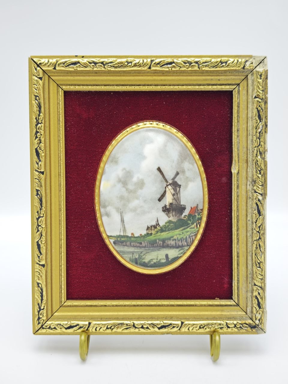 Элегантное настенное панно с классическим европейским пейзажем — мельница на фоне сельской идиллии, выполненное в технике деколи на фарфоре. Композиция оформлена в декоративную деревянную раму с эффектом позолоты и бархатным фоном глубокого бордового оттенка. На обороте указано происхождение: Англия, Fine Bone China, что указывает на европейское производство середины XX века. Присутствуют следы времени — небольшие сколы и потертости рамы, придающие предмету винтажный характер.