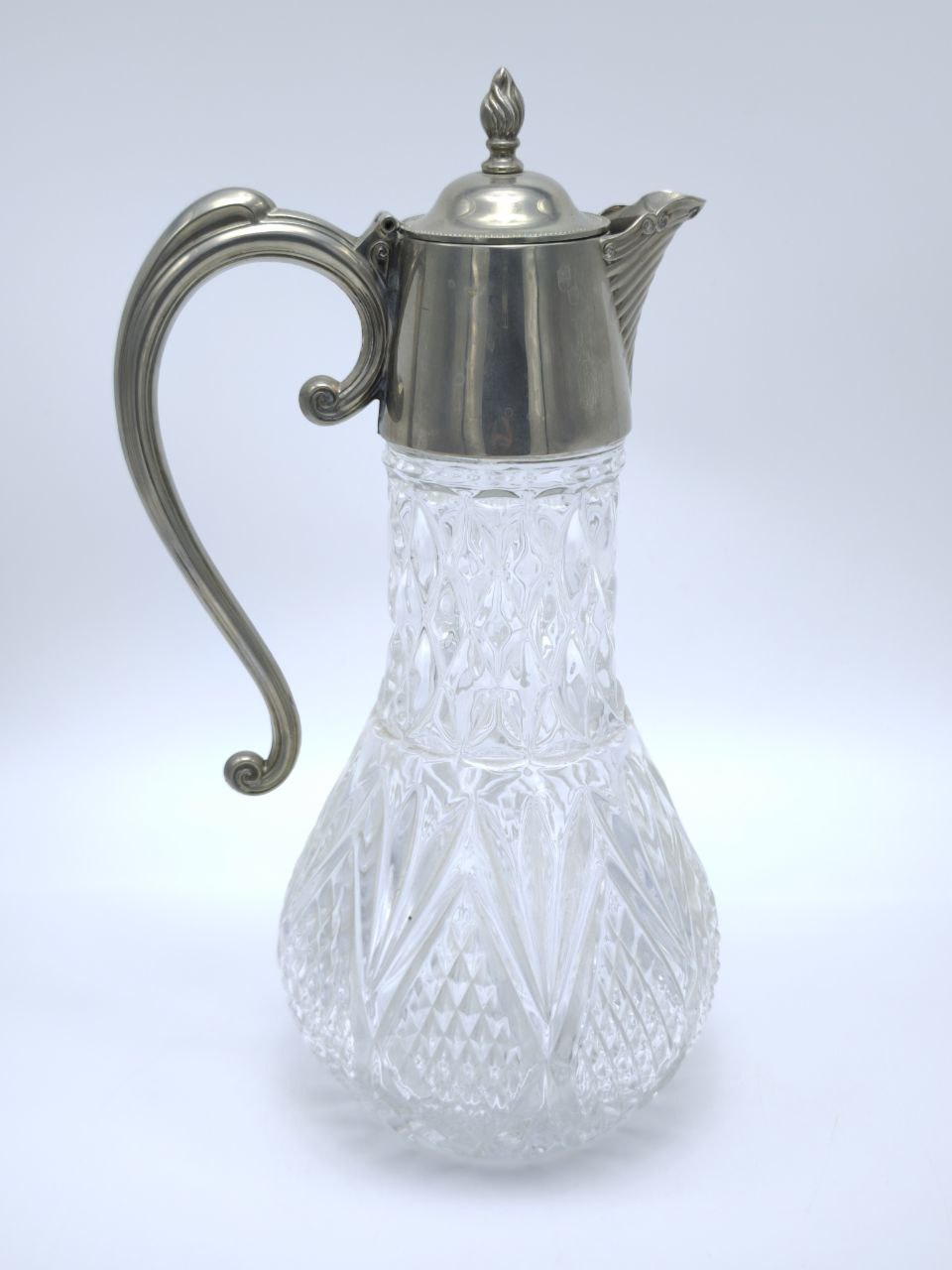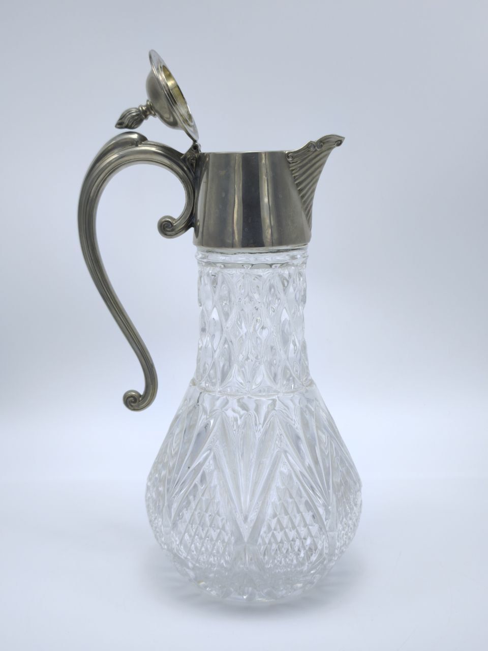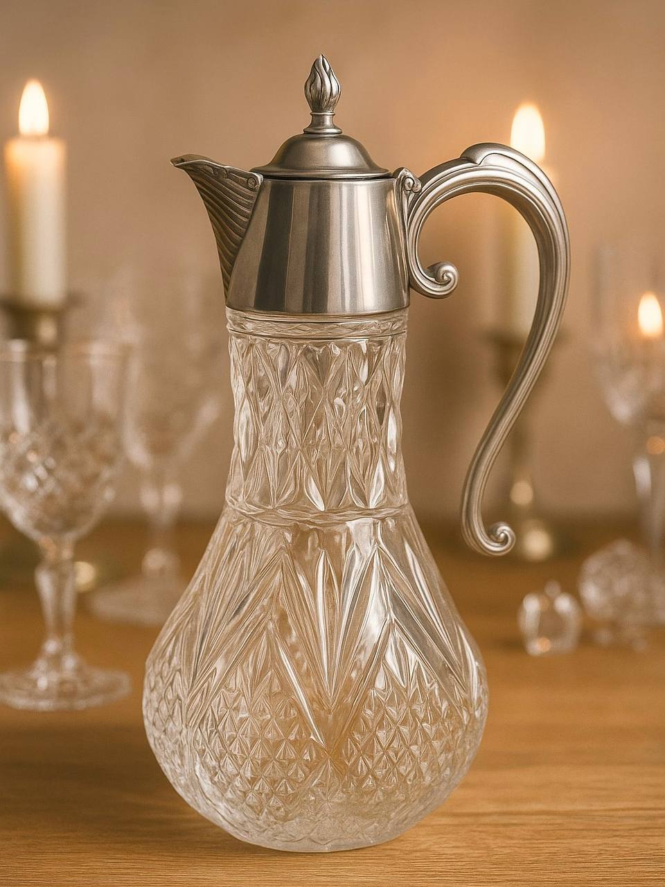 Этот винтажный декантер для вина из Англии — настоящий образец утончённого вкуса и мастерства. Изготовлен из высокого качества резного стекла с изящным узором, который красиво преломляет свет и добавляет декоративности. Верхняя часть изделия выполнена из металла с серебрением, что придаёт кувшину оттенок старины и изысканности. Ручка и крышка продуманы до мелочей: ручка имеет плавные линии, удобна в использовании и украшена классическим рельефным узором, а крышка — с небольшой округлой вершинкой, украшенной дополнительными деталями. Этот кувшин идеально подойдёт для сервировки вина или крепких напитков и станет великолепным акцентом в любой коллекции антиквариата или дополнит ваш винный стол. Временем он сохранил свой аутентичный шарм и может считаться громким памятником английской традиции классической эстетики. Такой декантер станет стильным подарком для ценителей винтажных предметов.