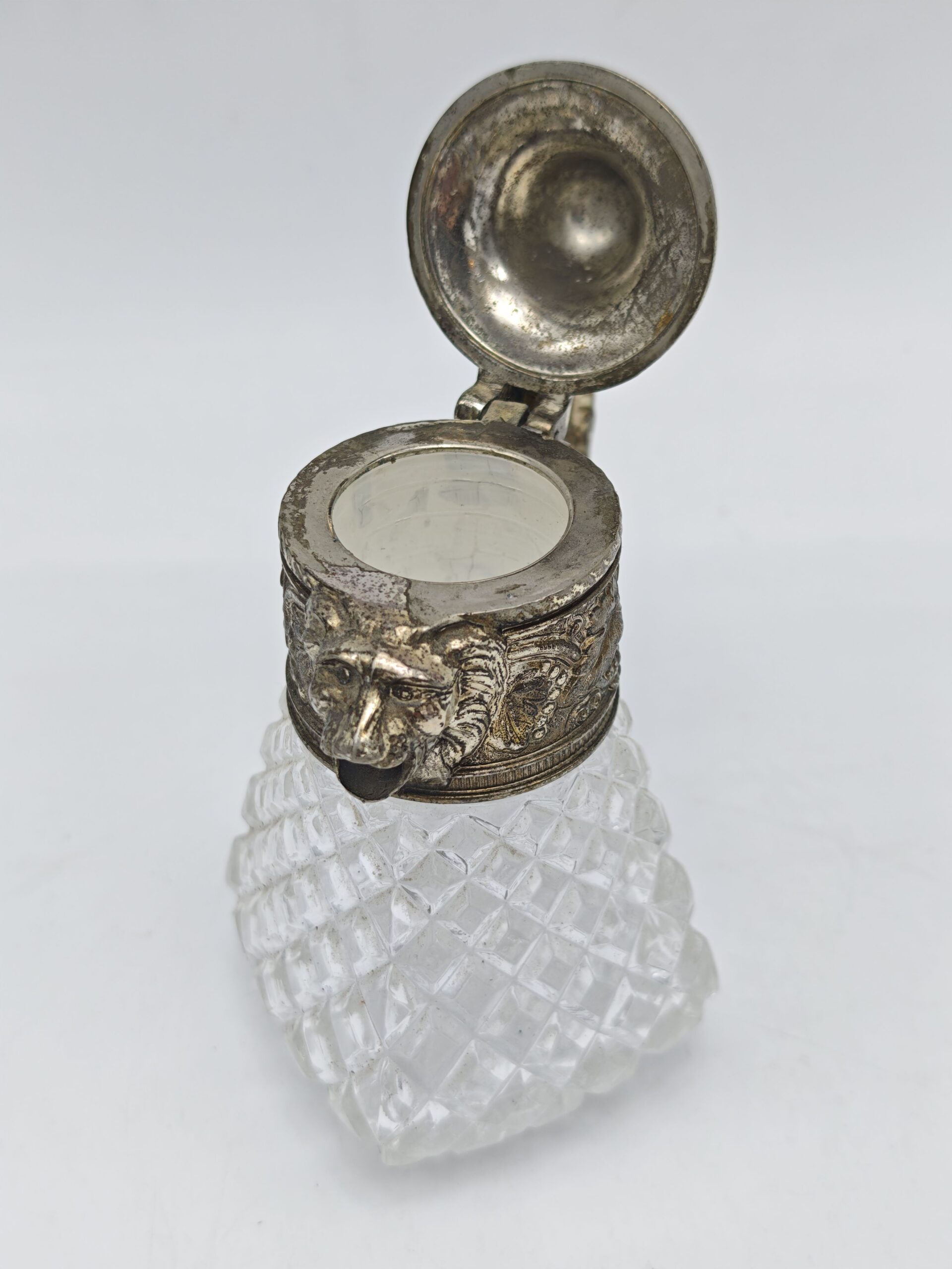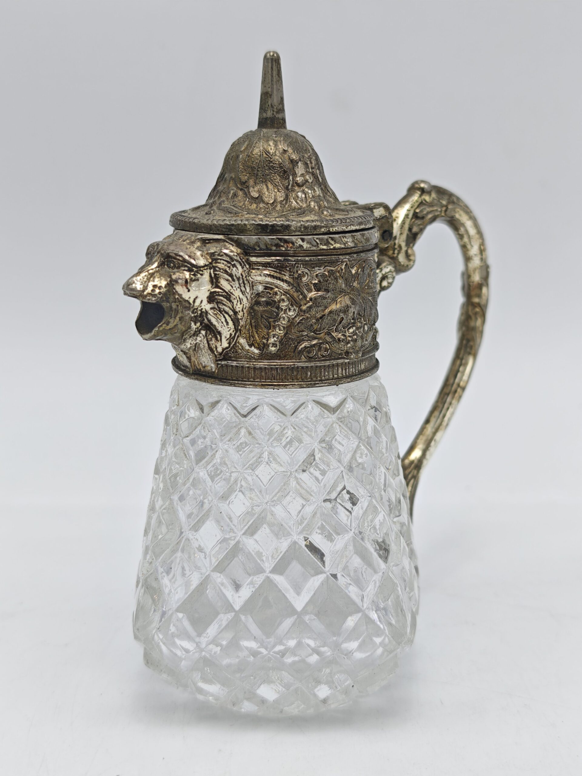 Винтажный декантер для вина из Англии — изысканный союз стеклянного мастерства и серебряной элегантностиЭтот роскошный английский декантер для вина — настоящий шедевр винтажного искусства. Созданный для ценителей аристократичной утончённости, он способен стать центральным элементом вашей сервировочной коллекции или стильным украшением интерьера. Изделие представляет собой гармоничное сочетание резного стекла и изысканной металлической отделки с серебрением, что придаёт ему уникальный и элегантный облик.Корпус кувшина выполнен из прочного стекла с алмазной огранкой, которая создаёт эффектное сияние при попадании света. Такой узор не только украшает предмет, но и свидетельствует о мастерстве его создателей. Верхняя часть декантера — настоящий произведение искусства: металлический обод и крышка украшены сложным декоративным рисунком с мотивами виноградных лоз, символизирующих изысканный вкус и изобилие. Особое внимание привлекает носик в форме львиной головы — знак силы и благородства, который добавляет изделию выразительности и индивидуальности.Ручка, выполненная из металла с серебряным покрытием, изогнута так, чтобы украшать изделие и обеспечивать комфорт в использовании. Декантер можно использовать для подачи любимых вин, крепких напитков, воды или других жидкостей, а также как декоративный элемент.Этот кувшин станет роскошным пополнением вашей коллекции, идеальным выбором для торжественных случаев или великолепным подарком для любителей антиквариата. Благодаря своему дизайну, сочетающему богатую эстетику и утилитарность, он способен подчеркнуть любой интерьер, добавив нотку английской роскоши в ваш дом.