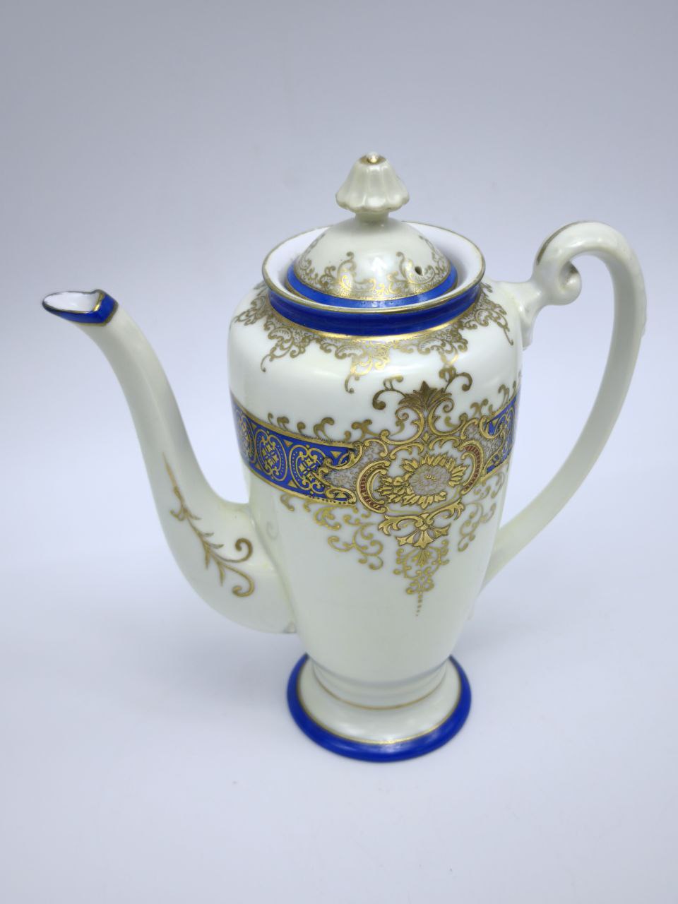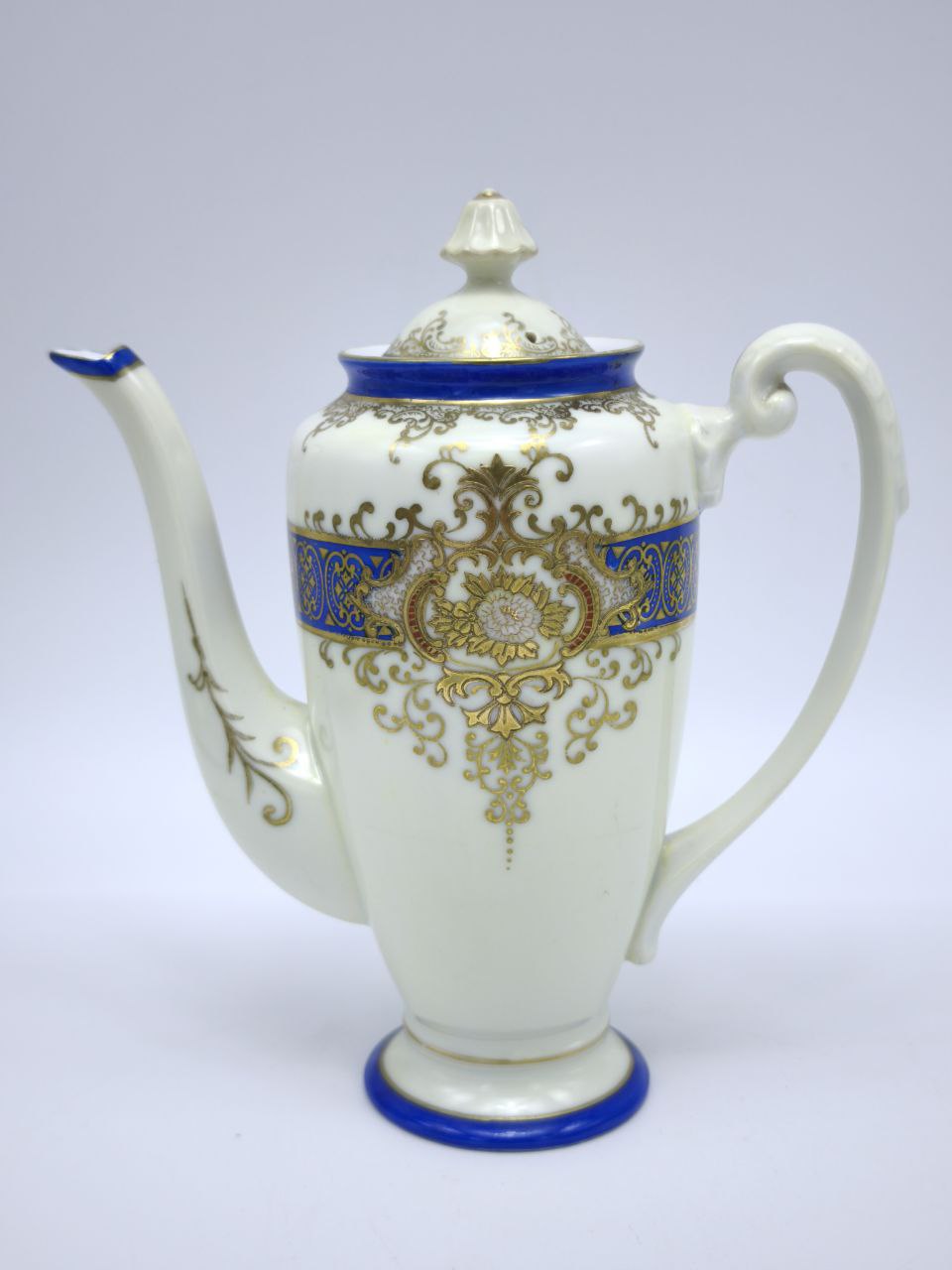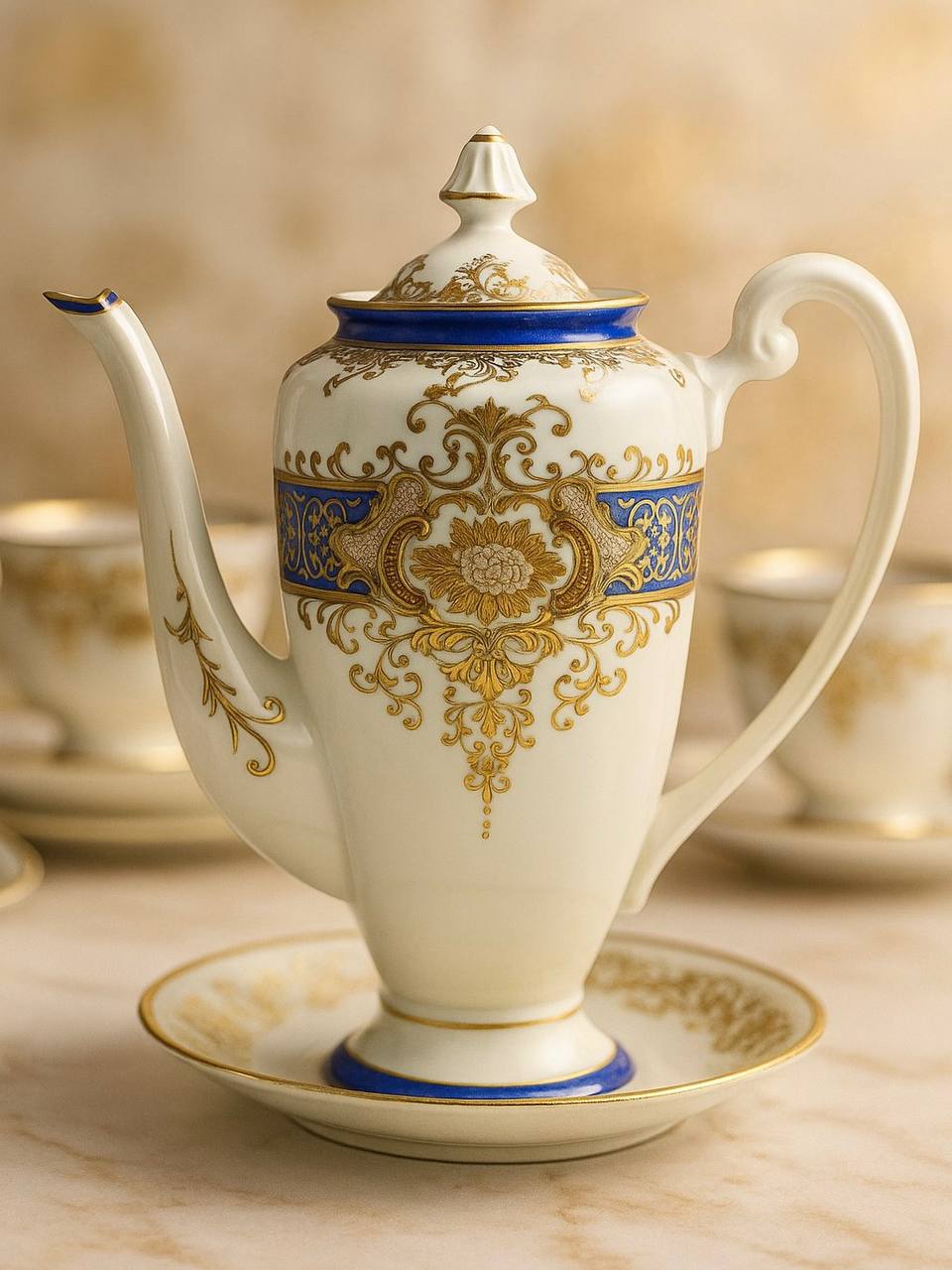 Погрузитесь в атмосферу утончённой роскоши и изысканного вкуса с нашим винтажным фарфоровым чайником, который станет настоящей жемчужиной вашей коллекции посуды. Этот изумительный чайник создан для тех, кто ценит красоту, грацию и историческое наследие, воплощённое в утончённых вещах.Чайник выполнен из высококачественного фарфора, который славится своей прочностью и долговечностью, а его поверхность украшена изящным королевским орнаментом в насыщенных сине-золотых тонах. Этот искусно выполненный рисунок подчёркивает ваше чувство стиля и безупречный вкус, придавая каждому чаепитию атмосферу настоящей роскоши.Элегантная форма чайника, с его изогнутым носиком для аккуратного и удобного наливания, напоминает о традициях прошлого и переносит вас в особую эпоху, когда чаепитие было настоящим ритуалом. Эргономичная ручка обеспечивает удобный захват, что делает каждое использование этого чайника настоящим удовольствием.Сервируя чай с помощью этого великолепного чайника, вы создадите атмосферу аристократического приёма и украсите своё пространство, добавив ему нотку изящества и шикарности. Он будет великолепно смотреться на любом столе, от самой обыденной сервировки до самых торжественных случаев, и обязательно привлечёт внимание ваших гостей.Этот винтажный фарфоровый чайник станет не только украшением вашего дома, но и замечательным подарком для близких, ценящих красоту и качество. Идеально подходит для свадеб, юбилеев, дней рождений или как особый презент без повода, который станет запоминающийся и значимой деталью интерьера.Не упустите возможность приобрести этот великолепный чайник, который гармонично объединяет в себе эстетику и функциональность, предлагая вам насладиться чаепитием в стиле королевской роскоши. Этот чайник — не просто предмет быта, а настоящее произведение искусства, которое станет семейной реликвией и будет передаваться из поколения в поколение.