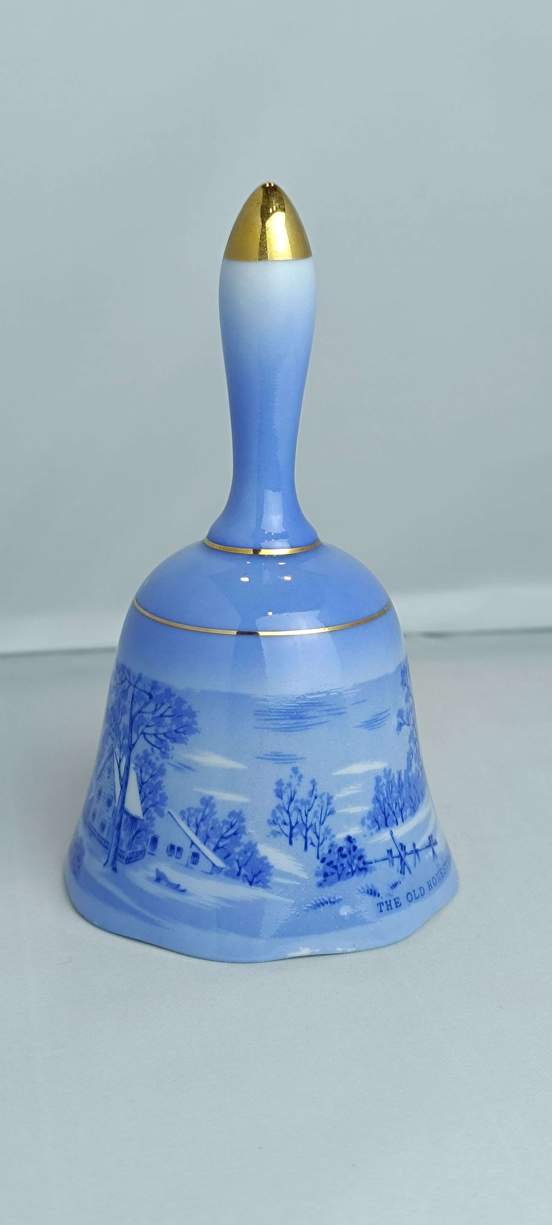 Винтажный колокольчик с расписным узором зимнего пейзажа в голубых тонах. Создан из фарфора. Произведен в середине 20 века в Англии. Звенит.