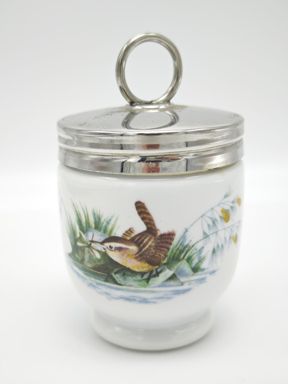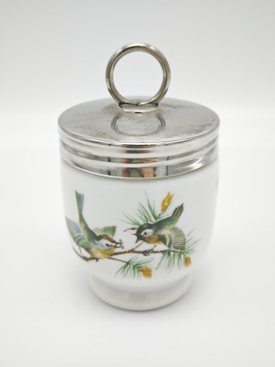 Представляем вашему вниманию настоящий шедевр винтажной посуды — элегантный фарфоровый кодлер для одного яйца, который станет не просто функциональным предметом на вашем столе, но и настоящим произведением искусства. Этот кодлер, созданный в лучших традициях европейской керамики, сочетает в себе изысканность формы, нежность росписи и практичность использования. Кодлер изготовлен из высококачественного белого фарфора, обладающего характерной гладкостью и легким блеском. Его форма — классическая, слегка расширяющаяся книзу, что обеспечивает устойчивость и удобство в использовании. Основание кодлера выполнено с небольшим поддоном, предотвращающим скольжение по столу и защищающим поверхность от возможных капель воды или масла. Особое очарование этому предмету придает ручная роспись, украшающая боковую поверхность. На фоне чистой белой глазури изображены две очаровательные птички — возможно, синицы или синички — сидящие на ветке хвойного дерева, вероятно, сосны или ели. Птицы изображены в динамичной позе: одна из них, с расправленными крыльями и ярко-желтым брюшком, будто только что приземлилась на ветку, а другая, с зеленовато-серым оперением, наклонилась к ней, словно в приветствии или игре. Вокруг птиц разбросаны мелкие желтые цветочки или шишки, добавляющие композиции живости и весеннего настроения. Роспись выполнена в тонких, аккуратных линиях, с вниманием к деталям перьев и веточек — это работа мастера, понимающего красоту природы. Крышка кодлера изготовлена из металла, покрытого серебром или серебрением, что придает изделию благородный и роскошный вид. Крышка плотно прилегает к основанию, сохраняя тепло яйца и защищая его от насекомых. На верхней части крышки расположен удобный круглый ручной кольцо, которое позволяет легко снимать и надевать крышку одной рукой. Это не только функциональный элемент, но и декоративный — оно гармонично дополняет общую композицию и подчеркивает винтажный стиль изделия. Такой кодлер — идеальный выбор для ценителей винтажной посуды, коллекционеров, а также для тех, кто хочет добавить изюминку в свой повседневный завтрак. Он прекрасно подойдет для подачи вареного яйца, особенно если вы любите начинать день с чего-то особенного и красивого. Кроме того, этот кодлер станет замечательным подарком для друзей, родственников или коллег — он несет в себе тепло, уют и внимание к деталям. Изделие находится в отличном состоянии, без сколов, трещин или потертостей, что говорит о бережном обращении с ним. Это не просто посуда — это часть истории, которая может стать частью вашей жизни. Наслаждайтесь каждым утренним моментом с этим винтажным кодлером, и пусть ваши завтраки станут по-настоящему волшебными!