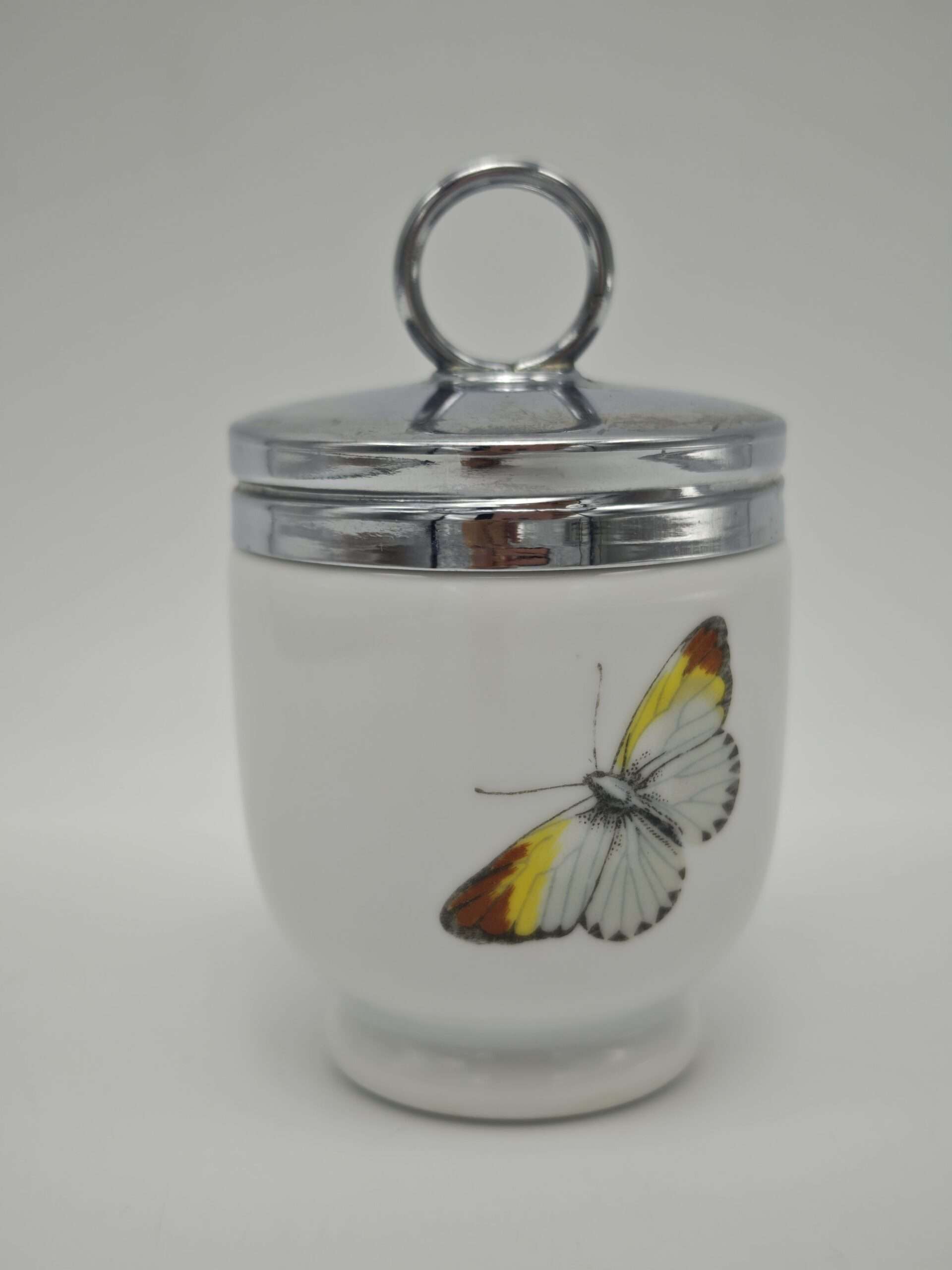 Одиночный английский кодлер с редким узором. Предназначен для приготовления яиц. Так же имеет название пашотница. Изготовлен в 20 веке из фарфора на мануфактуре Royal Worcester (на дне есть клеймо производителя). Английские кодлеры с откручивающейся крышкой являются уникальными, так как больше не производятся – мануфактура Роял Ворчестер была уничтожена. Очень полезны в быту, в них можно готовить вареные яйца с различными наполнителями: ветчиной, курицей, зеленью, сыром и другими ингредиентами. Подаются к столу прямо вместе с ёмкостью и не нуждаются в дополнительной сервировке.