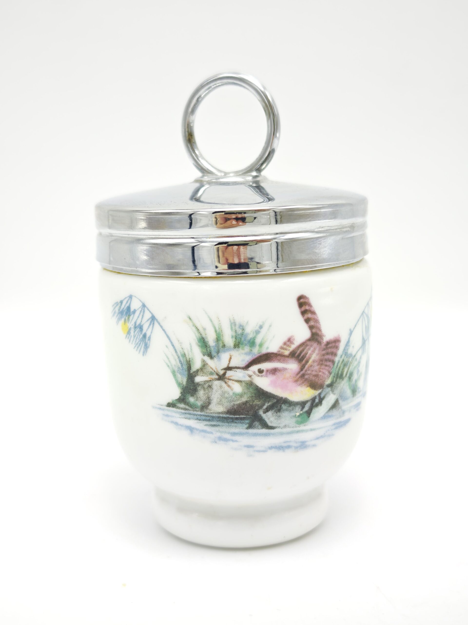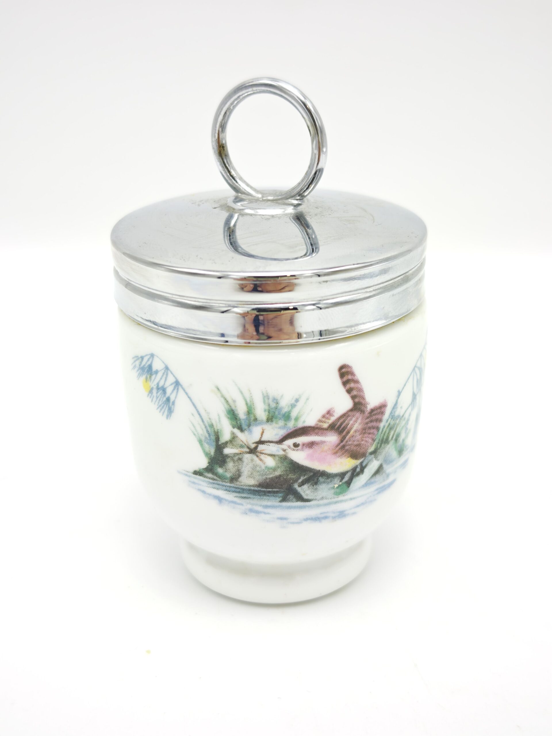 Одиночный английский кодлер. Предназначен для приготовления яиц. Так же имеет название пашотница. Изготовлен в 20 веке из фарфора на мануфактуре Royal Worcester (на дне есть клеймо производителя). Английские кодлеры с откручивающейся крышкой являются уникальными, так как больше не производятся – мануфактура Роял Ворчестер была уничтожена. Очень полезны в быту, в них можно готовить вареные яйца с различными наполнителями: ветчиной, курицей, зеленью, сыром и другими ингредиентами. Подаются к столу прямо вместе с ёмкостью и не нуждаются в дополнительной сервировке.