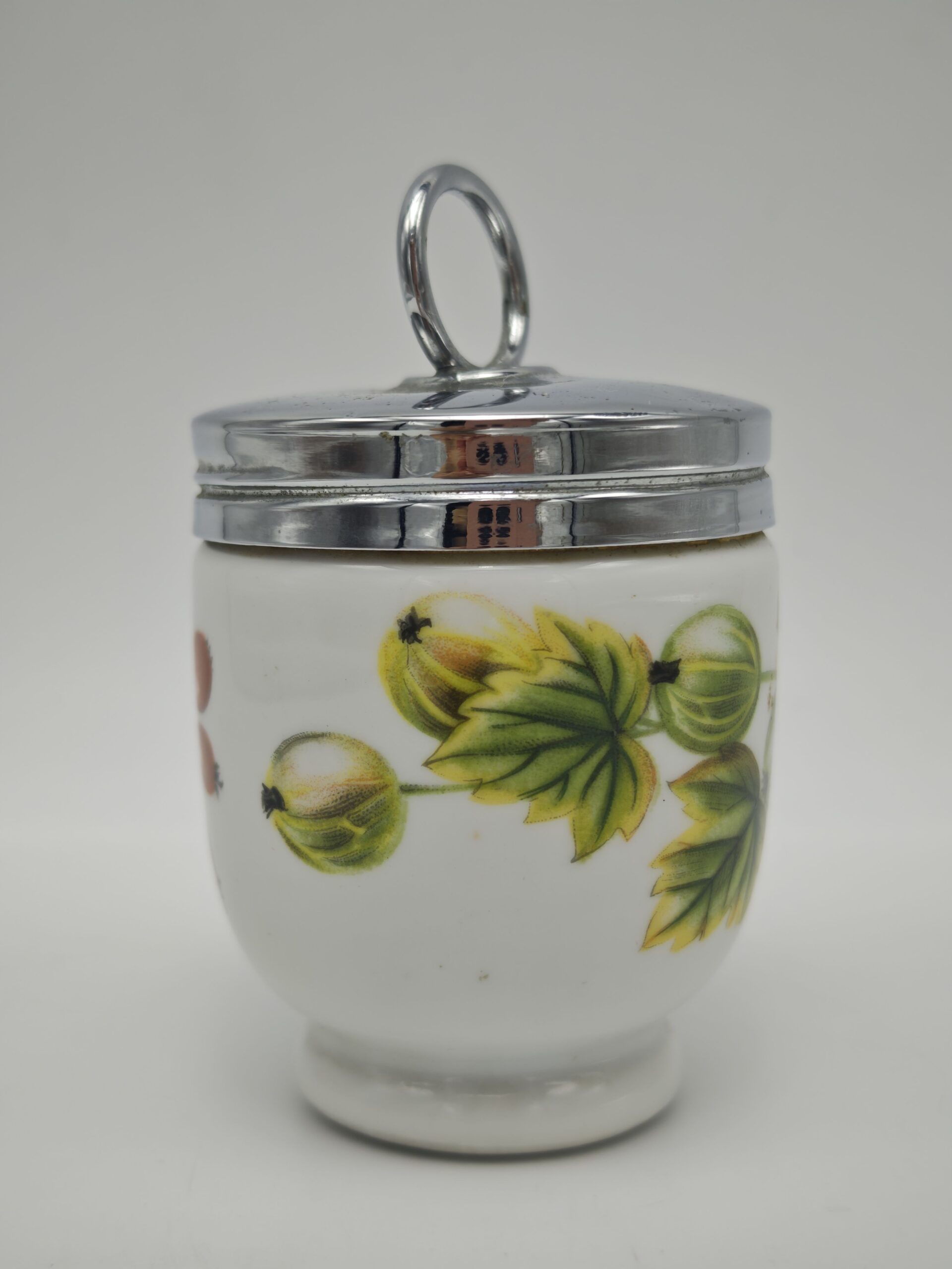 Кодлер «Крыжовник» на 1 яйцо. Предназначен для приготовления яиц. Так же имеет название пашотница. Изготовлен в 20 веке из фарфора на мануфактуре Royal Worcester (на дне есть клеймо производителя).Англи йские кодлеры с откручивающейся крышкой являются уникальными, так как больше не производятся – мануфактура Роял Ворчестер была уничтожена. Очень полезны в быту, в них можно готовить вареные яйца с различными наполнителями: ветчиной, курицей, зеленью, сыром и другими ингредиентами. Подаются к столу прямо вместе с ёмкостью и не нуждаются в дополнительной сервировке.