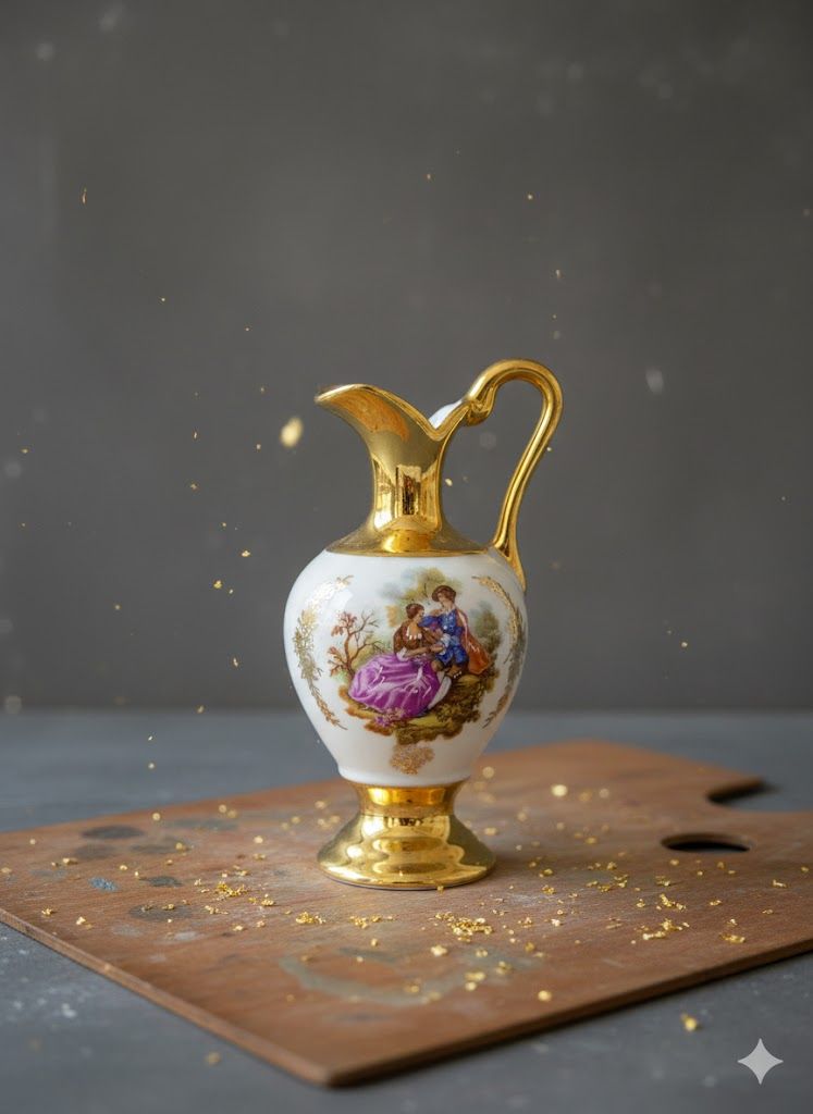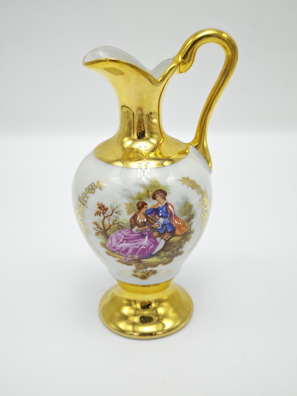 Изящный фарфоровый кувшин с ручной позолотой и классической романтической сценой — характерный стиль французского Лиможа. Такой декоративный предмет создавался как элемент столового декора и считался признаком утончённого вкуса. Благодаря аккуратной росписи и сохранности позолоты кувшин представляет коллекционную ценность. Идеален для интерьера в стиле классицизм, прованс или для собрания антикварного фарфора.