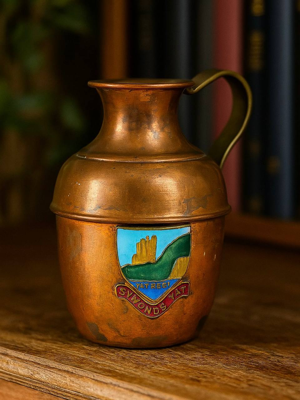 Познакомьтесь с элегантным винтажным кувшином из меди и латуни, который несет в себе дух времени и неизменную красоту классического декоративного искусства. Это изысканное изделие выделяется необычайным сочетанием теплого медного блеска и прочных латунных деталей, украшенных яркой эмблемой Symonds Yat, придающей ему характер и историческую ценность.Кувшин выполнен с удивительным мастерством, каждая деталь которого отражает высокий уровень старинного ремесла. Его приглушенный медный цвет и плавные линии создают привлекательный силуэт, а латунная ручка обеспечивает удобство в использовании. Особое внимание заслуживает эмблема, вручную нанесенная на поверхность изделия, что делает каждый кувшин уникальным в своем роде. Symonds Yat – место с богатой историей и захватывающими пейзажами, и этот элемент сразу придает изделию индивидуальность и символику.Очарование этого винтажного кувшина не ограничивается его внешним видом. Он станет прекрасным выбором для коллекционеров и любителей истории, а также тех, кто любит окружать себя уникальными и качественными вещами. Мягкий блеск меди создает уютную и комфортную атмосферу, наполняющую помещение характером и теплом. Этот кувшин привнесет в ваш интерьер нотки старинного британского шарма и станет стильным акцентом в любой комнате.Изделие прекрасно подходит не только для декоративных целей — его можно использовать для сервировки напитков, что добавит особую изюминку вашему столу во время приемов гостей или семейных ужинов. Кувшин станет отличным подарком на свадьбу, юбилей или любое другое значимое событие, особенно для людей, ценящих историю и искусство.Оцените неповторимую винтажную эстетику, сочетая ее с современным комфортом. Превратите ваш дом в место, где искусство встречается с историей, добавив в него этот уникальный медно-латунный кувшин. Вы не просто приобретаете предмет декора — вы становитесь обладателем произведения искусства, которое хранит в себе кусочек прошлого.