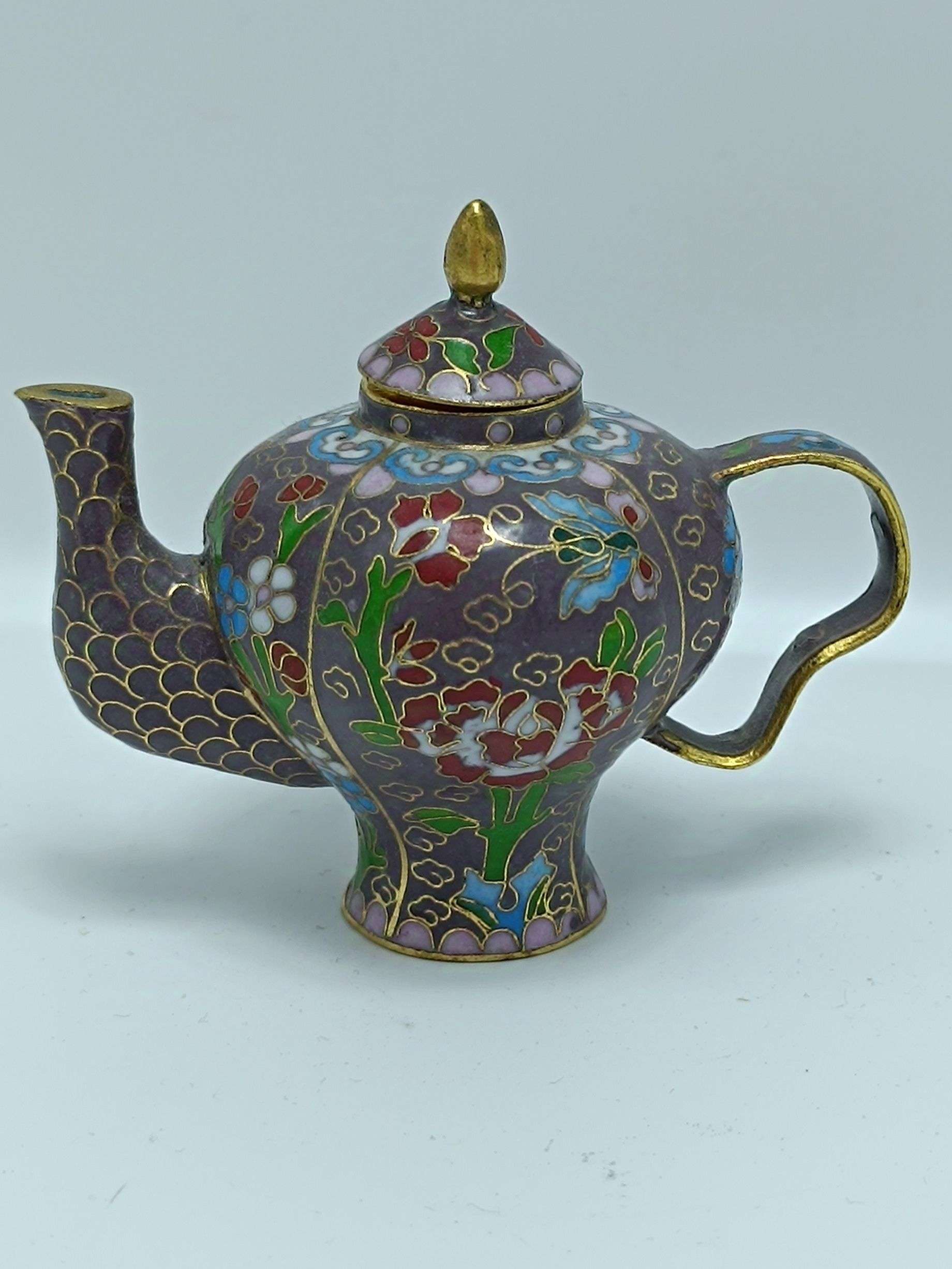 Красивый редкий винтажный миниатюрный чайник, эмаль клуазоне, латунь.