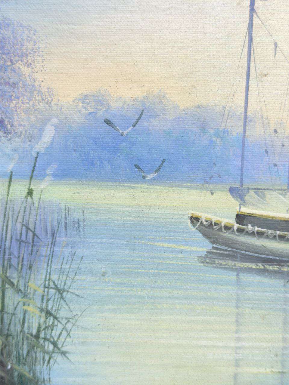 Перед вами жемчужина винтажного искусства — картина маслом на холсте, размером 28,5х23,5 см, созданная во второй половине 20 века. Это произведение искусства способно поразить глубиной ощущения спокойствия и умиротворения, которое оно дарит. На картине изображен морской пейзаж, в который погружаешься с первого взгляда. Нежная игра светло-голубых и пастельных оттенков создает впечатление раннего утра или позднего вечера у кромки воды, когда природа начинает или завершает свой цикл. Композиция картины позволяет зрителю выбрать для себя желаемое время дня, создавая интерактивный элемент взаимодействия с искусством.В центре композиции — тихая гавань с пришвартованным парусником, чьи мачты вытянуты к бледно-голубому небу. Легкое дуновение ветра заставляет незаметно колебаться флаги, и создается иллюзия движения. Хрупкие силуэты деревьев, скрытых туманом, добавляют картине загадочности, а летающие птицы привносят ощущение безмятежности. Художнику удалось тонко передать морскую стихию в лучшем ее проявлении — во время покоя и умиротворения.Картина обрамлена резной деревянной рамой с позолотой, что подчеркивает её утонченное изящество и гармонию. Эта рама добавляет картине утилитарное совершенство, придавая ей статус достойного представителя любой художественной коллекции или интерьерного пространства.Это произведение искусства идеально подходит для тех, кто ищет уникальный акцент для дома или офиса. Оно прекрасно интегрируется в современные и классические интерьеры, создавая уют и эстетическое богатство. Такой арт-объект станет идеальным подарком для истинных ценителей искусства моря и природы в целом, а также для всех тех, кто стремится окружить себя вещами, несущими историю и душу.