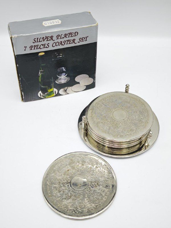 Представляем вашему вниманию редкий и изысканный винтажный набор из семи посеребренных костеров, упакованных в оригинальную картонную коробку с надписью “SILVER PLATED 7 PIECES COASTER SET”. Этот набор — не просто аксессуар для стола, а настоящий артефакт эпохи, который перенесет вас в атмосферу утонченности и благородства прошлого века.Каждый костер выполнен из металла с покрытием серебра, что придает им благородный блеск и долговечность. Диаметр одного костера составляет 9 или 11,5 см ( в наборе два размера) — идеальный размер для бокала или чашки. Поверхность костеров украшена тончайшей гравировкой в классическом стиле: узоры из завитков, листьев и орнаментальных элементов создают ощущение ручной работы и художественной ценности. Такой дизайн не только защищает вашу мебель от влаги и царапин, но и служит изысканным декоративным элементом на любом столе — будь то обеденный, кофейный или даже рабочий.Набор комплектуется специальной подставкой-держателем с четырьмя ножками и шариками на вершинах — это не только функциональная деталь, но и важный элемент дизайна. Подставка позволяет удобно хранить костеры в стопке, сохраняя их в порядке и защищая от повреждений. Благодаря ей набор выглядит как единое целое, готовое к демонстрации в интерьере.Особую ценность представляет собой оригинальная коробка — она не просто упаковка, а часть истории этого предмета. На ней сохранилась типографская печать, изображение бутылки и бокала, а также каталожный номер G10032, что указывает на его промышленное производство в определенную эпоху. Коробка имеет следы времени — потертости и легкие загрязнения — что лишь подчеркивает аутентичность и возраст изделия.Этот набор — идеальный выбор для коллекционеров винтажа, любителей ретро-интерьеров, а также для тех, кто хочет преподнести необычный и запоминающийся подарок. Он станет прекрасным дополнением к столовому сервизу, барному уголку или даже как элемент декора в офисе или гостиной. Винтажные костеры — это не просто полезный предмет, а символ статуса, вкуса и уважения к деталям.Состояние: хорошее для своего возраста, следы естественного износа, характерные для предметов такого типа. Серебряное покрытие сохранилось отлично, гравировка чёткая, подставка устойчивая, коробка целая, хотя и с признаками старения.Не упустите возможность обладать кусочком истории — этот набор не только радует глаз, но и рассказывает историю элегантности, которая не знает времени.