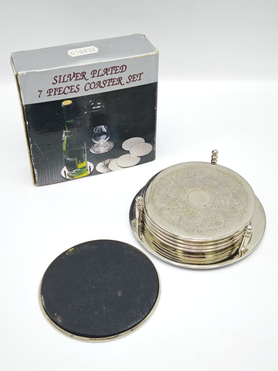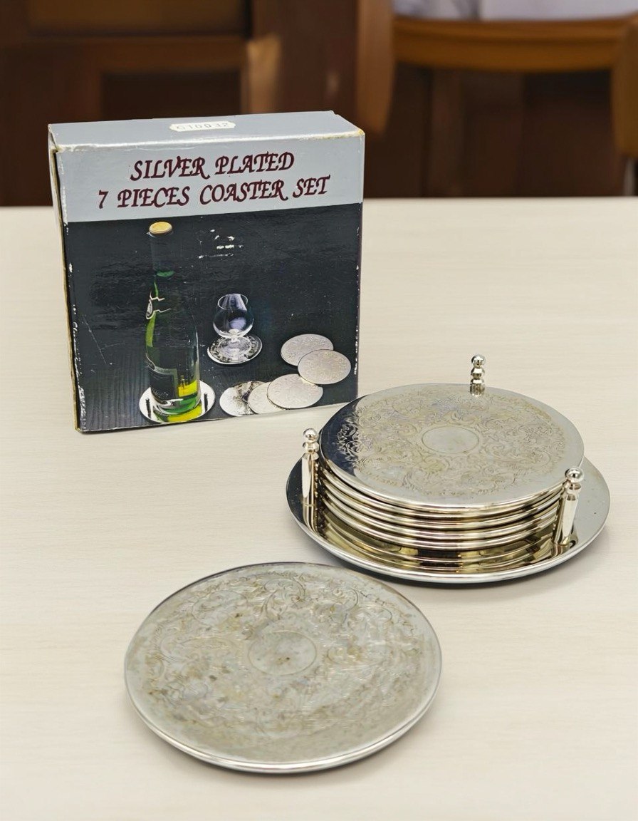 Винтажный набор из 7 посеребренных костеров с подставкой и родной коробкой роскошь прошлого для вашего стола. SILVER PLATED 7 PIECES COASTER SET.