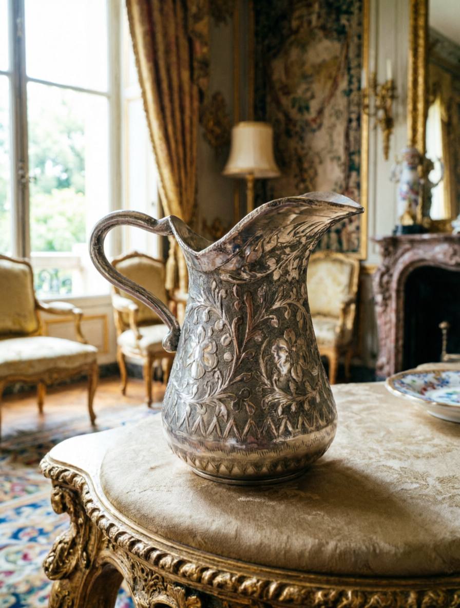 Изящный винтажный сливочник из посеребренного металла с богатой гравировкой — элегантный акцент для классической сервировки стола.