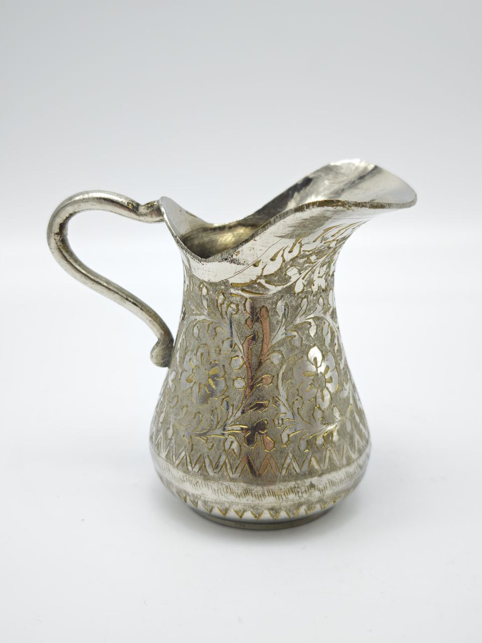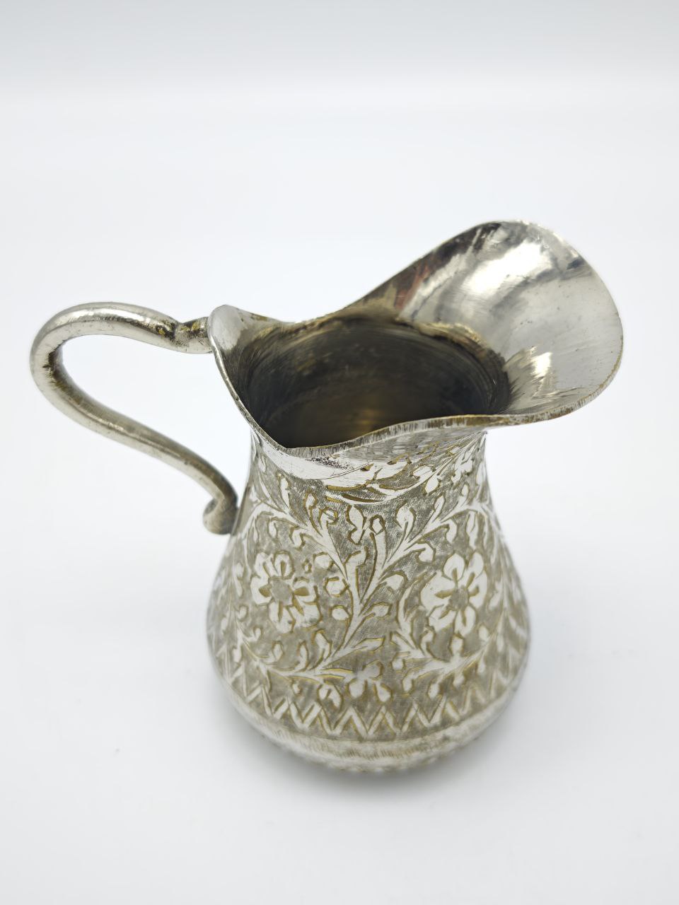 Корпус украшен тонкой гравировкой с цветочными мотивами и орнаментом. Волнистый край горлышка, изящная изогнутая ручка и декоративные узоры по всему корпусу создают ощущение утонченности и благородства.