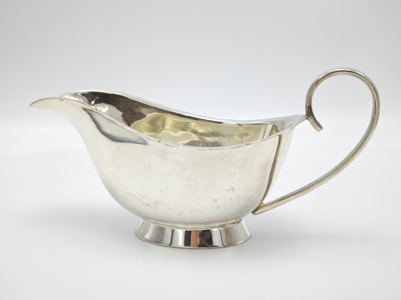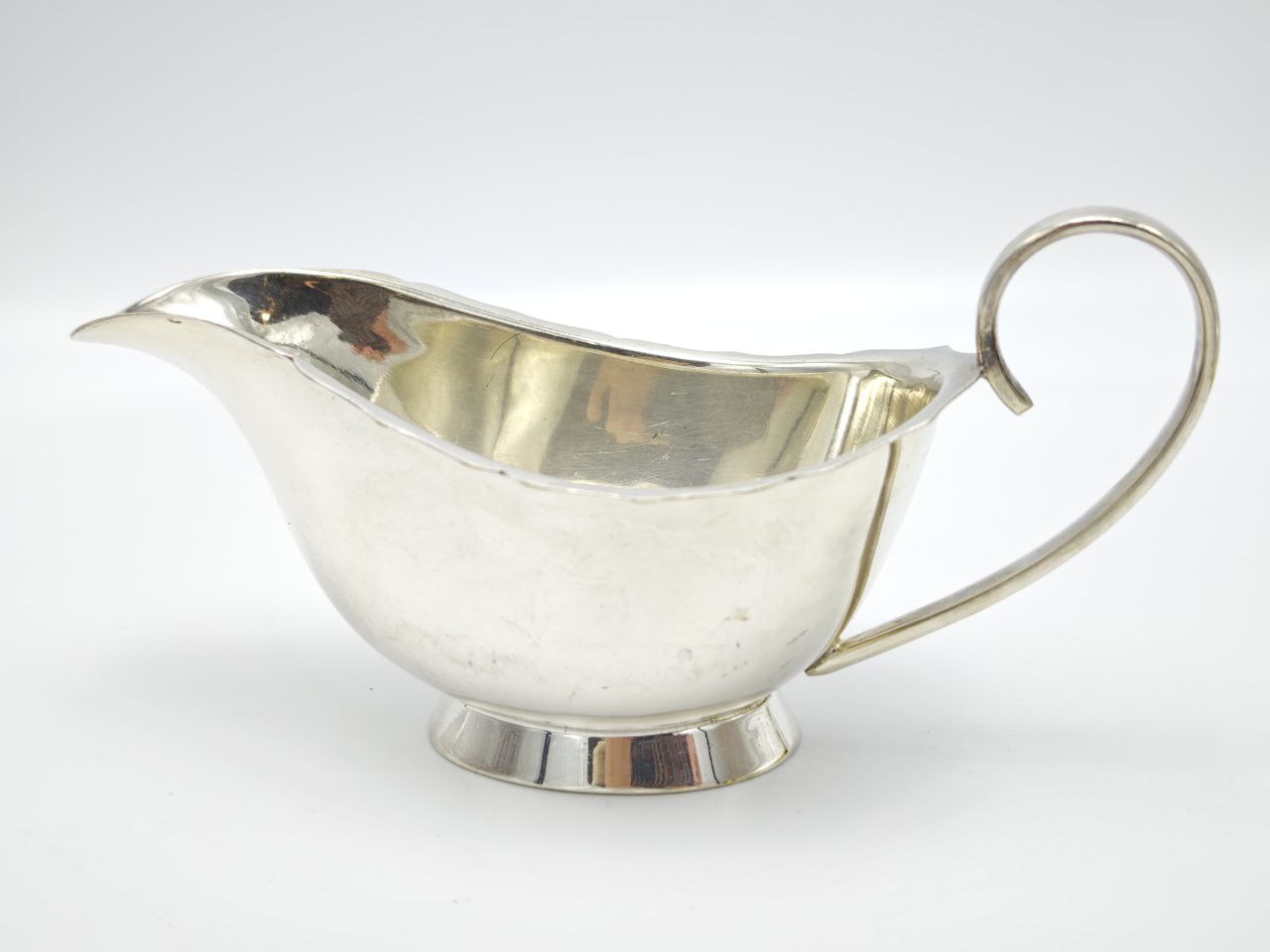 Изящная лодочка с волнистым краем, плавными линиями чаши и элегантной изогнутой ручкой создает ощущение утонченности и благородства. Посеребренная поверхность с характерным блеском и естественной патиной времени подчеркивает возраст и подлинность изделия.