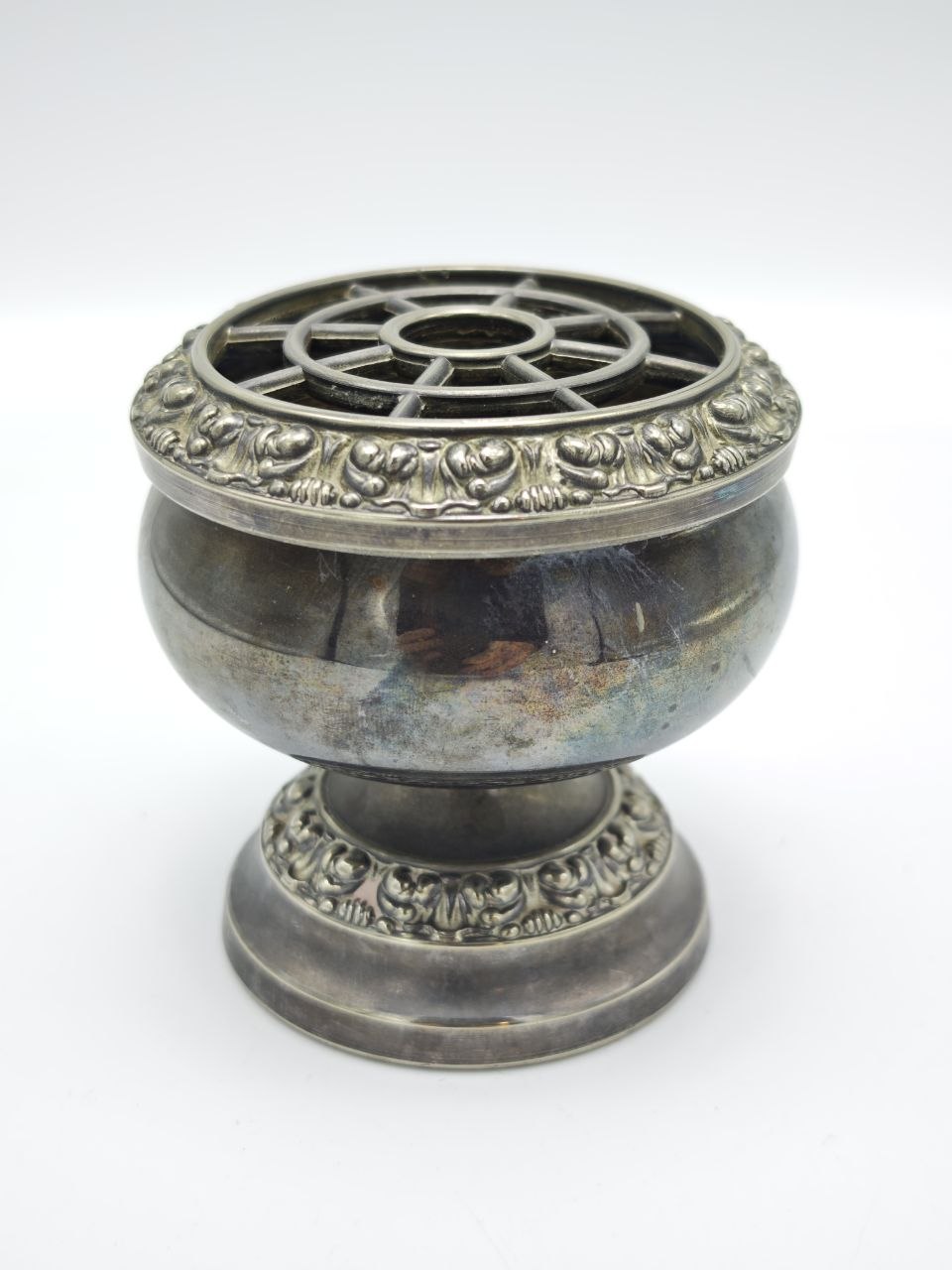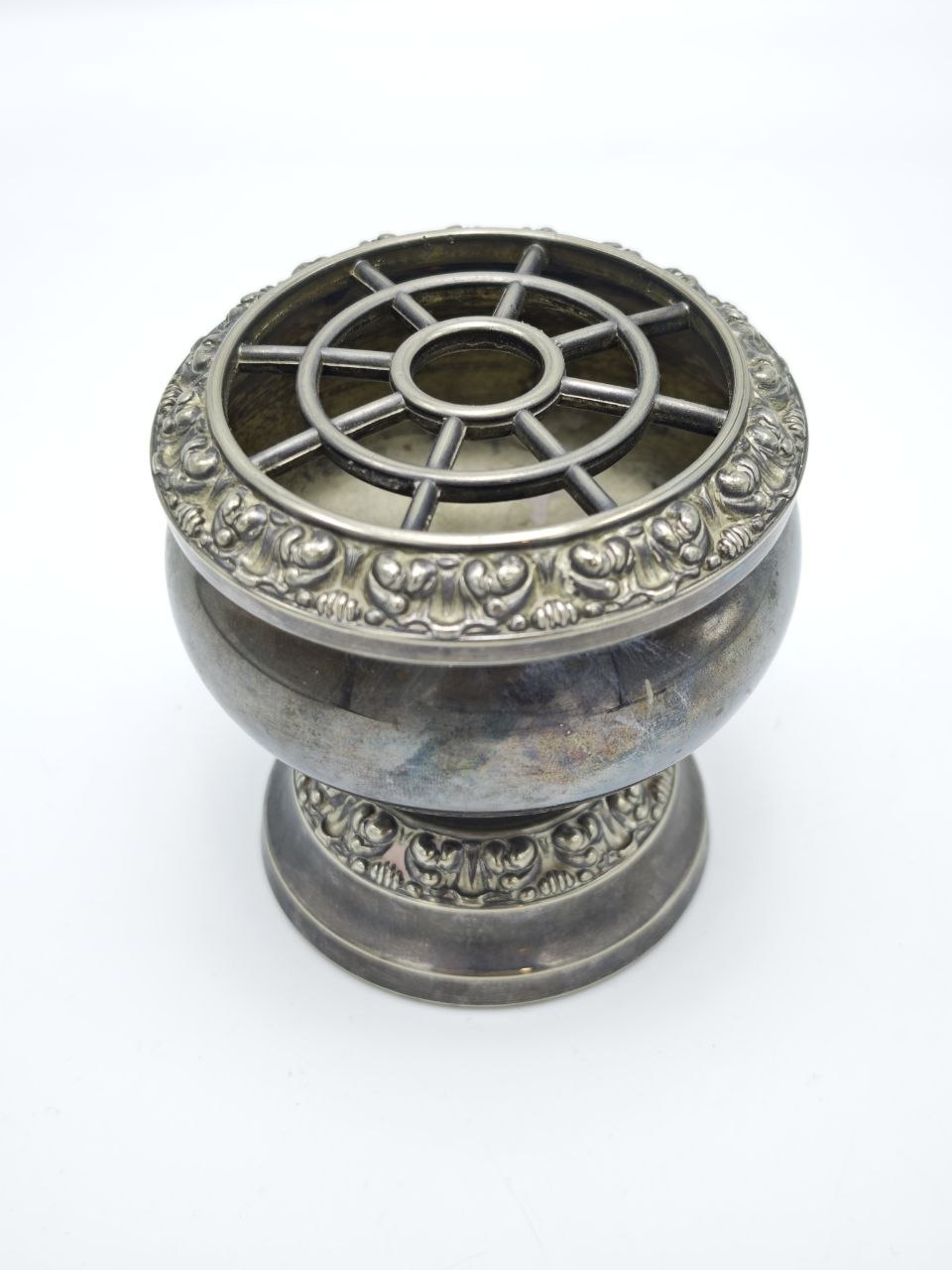 Элегантный роузбол предназначен для создания аккуратных цветочных композиций и сервировки интерьера. Посеребренная поверхность с классическим рельефным декором подчеркивает английский стиль середины XX века. На основании присутствует клеймо Silver Plated Made in England, что указывает на британское производство. Размер изделия 8×7.5 см, вес 200 г — компактный и удобный для размещения на столе или полке. Внутри видны следы времени и эксплуатации, что характерно для предметов данного периода.