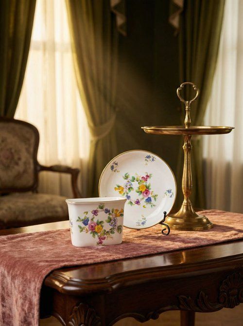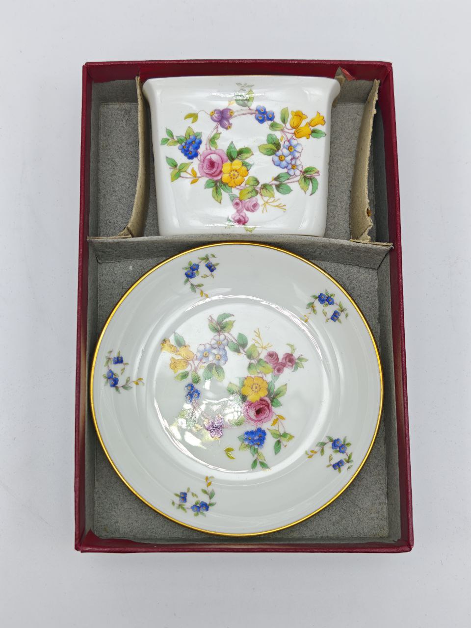 Изысканный сервировочный набор из костяного фарфора Minton, произведённый в Англии в 1965 году. В комплект входит вазочка размером 6×7,5 см и тарелочка диаметром 11 см — идеальное решение для зубочисток, конфет, орехов или подачи небольших угощений. Тонкая деколь с нежным цветочным венком и аккуратная ручная позолота по краю подчёркивают утончённость английской школы фарфора. Лёгкость костяного фарфора и изящная форма делают набор выразительным акцентом сервировки.