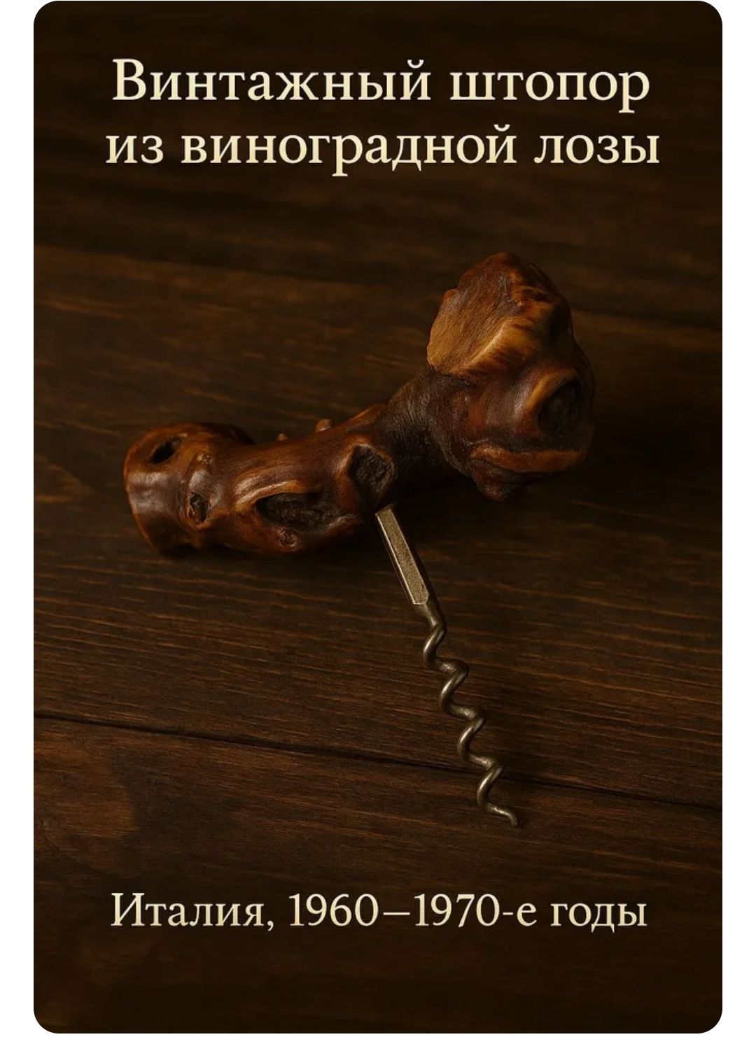 Откройте бутылку с историей! Винтажный штопор с уникальной ручкой из виноградной лозы — это не просто инструмент, а часть винной культуры Италии 1970‑х годов. Натуральная древесина лозы сохраняет природную фактуру, создавая неповторимый внешний вид и удобный хват. Такой штопор станет ценным предметом для коллекционеров, винных энтузиастов и тех, кто ценит атмосферу старинных виноделен.