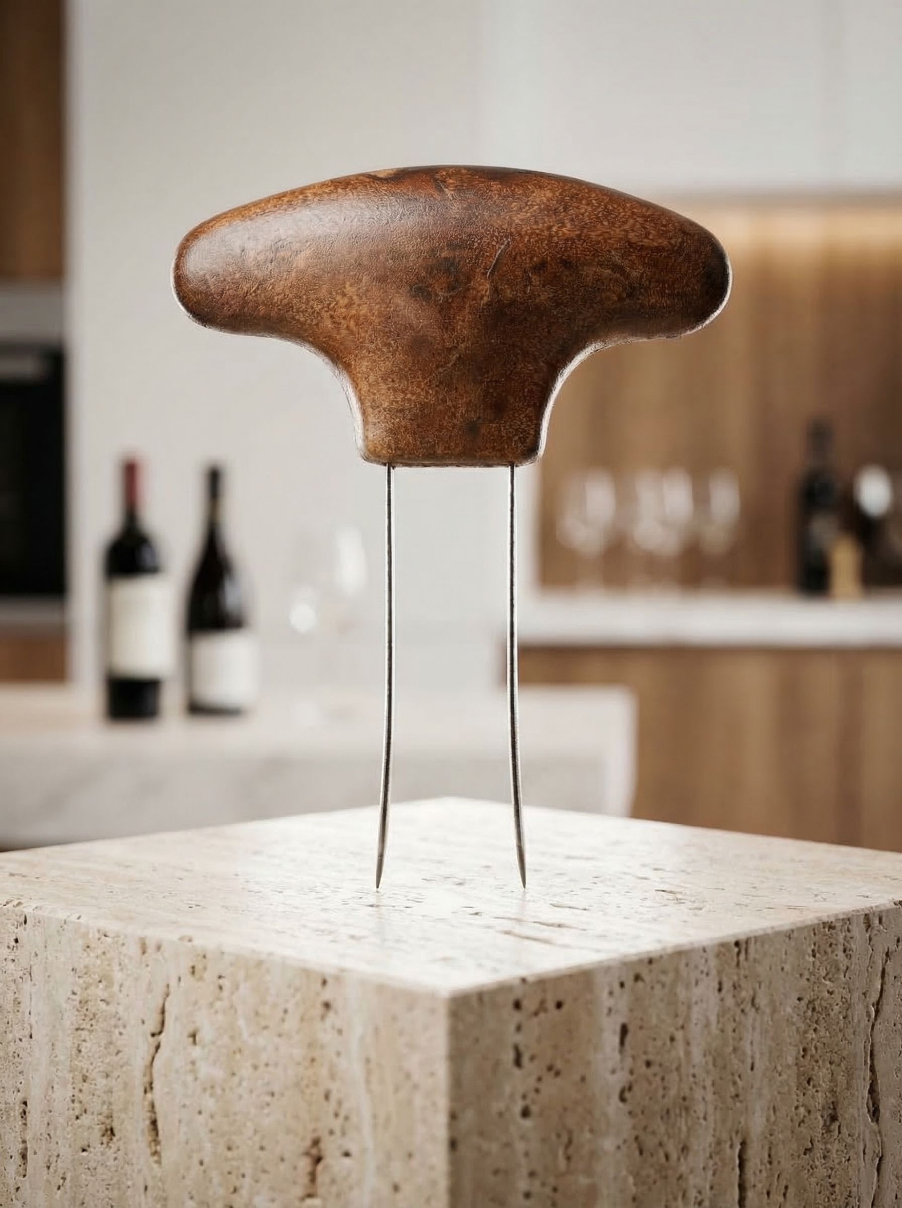 Британский цыганский штопор Wiggle Twist 1958 года — инструмент, рассчитанный на аккуратную работу с вином. Две тонкие иглы входят вдоль стенок бутылки и позволяют вынуть пробку без прокручивания, что особенно удобно при работе с выдержанными бутылками. Рукоять с естественной патиной выглядит выразительно и приятно ощущается в руке. В комплекте кожаный чехол, который защищает инструмент и добавляет ему законченный вид. Размер 10.5×7.5 см, вес 40 г — лёгкий и удобный аксессуар для винной подачи.