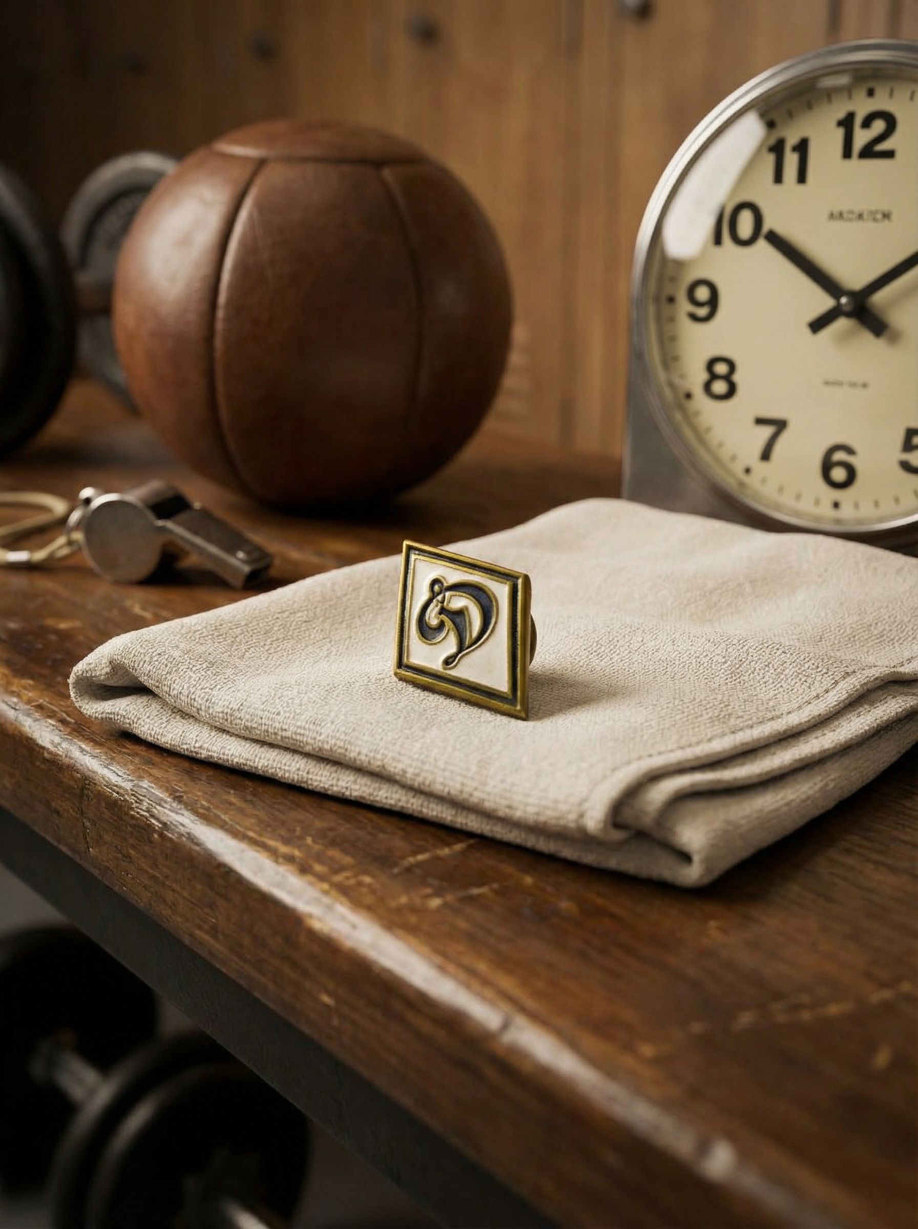Компактный металлический значок с ромбовидной формой и контрастным эмалевым полем. В центре — стилизованная литера, выполненная в плавной графике, характерной для массовой символики своего времени. Подобные знаки использовались как элемент принадлежности к объединению или мероприятию и легко считывались по форме. Небольшой размер делает предмет удобным для хранения и экспонирования.