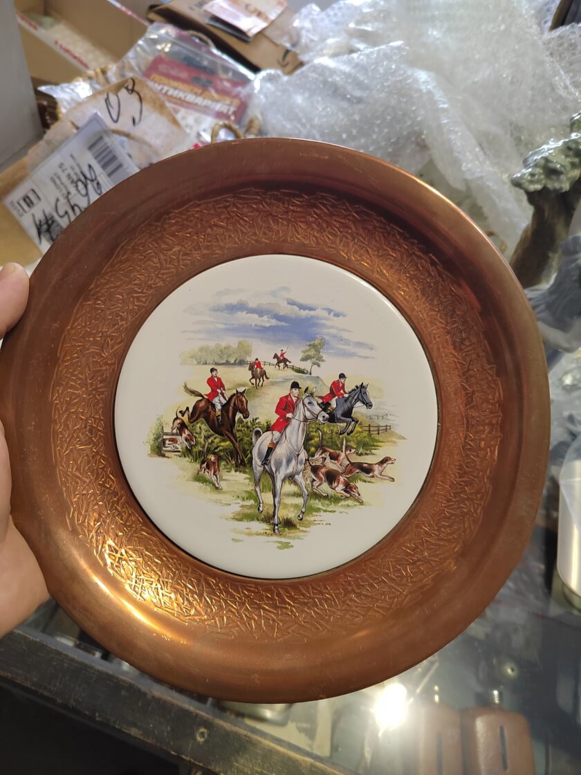 Винтажная тарелка из меди с фарфоровым основанием. Создана в Англии в середине 20 века. Оформлена охотничьим сюжетом: рисунок охоты верхом с собаками. Изображение нанесено техникой деколь. Медь украшена чеканкой. Тарелка сохранилась в прекрасном состоянии. Снабжена кольцом для подвеса. Станет интересным дополнением интерьера. Все лоты выставлены на нескольких площадках поэтому, пожалуйста, перед покупкой уточняйте наличие.