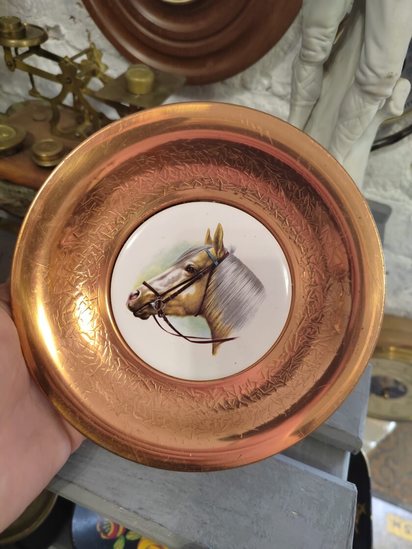Винтажная тарелка из меди с фарфоровым основанием. Создана в Англии в середине 20 века. Оформлена изображением головы светлой лошади. Рисунок нанесён техникой деколь. Медь украшена чеканкой. Тарелка сохранилась в отличном состоянии. Снабжена кольцом для подвеса. Станет интересным дополнением интерьера. Прекрасно впишется в декор загородного дома или конюшни. Все лоты выставлены на нескольких площадках поэтому, пожалуйста, перед покупкой уточняйте наличие.