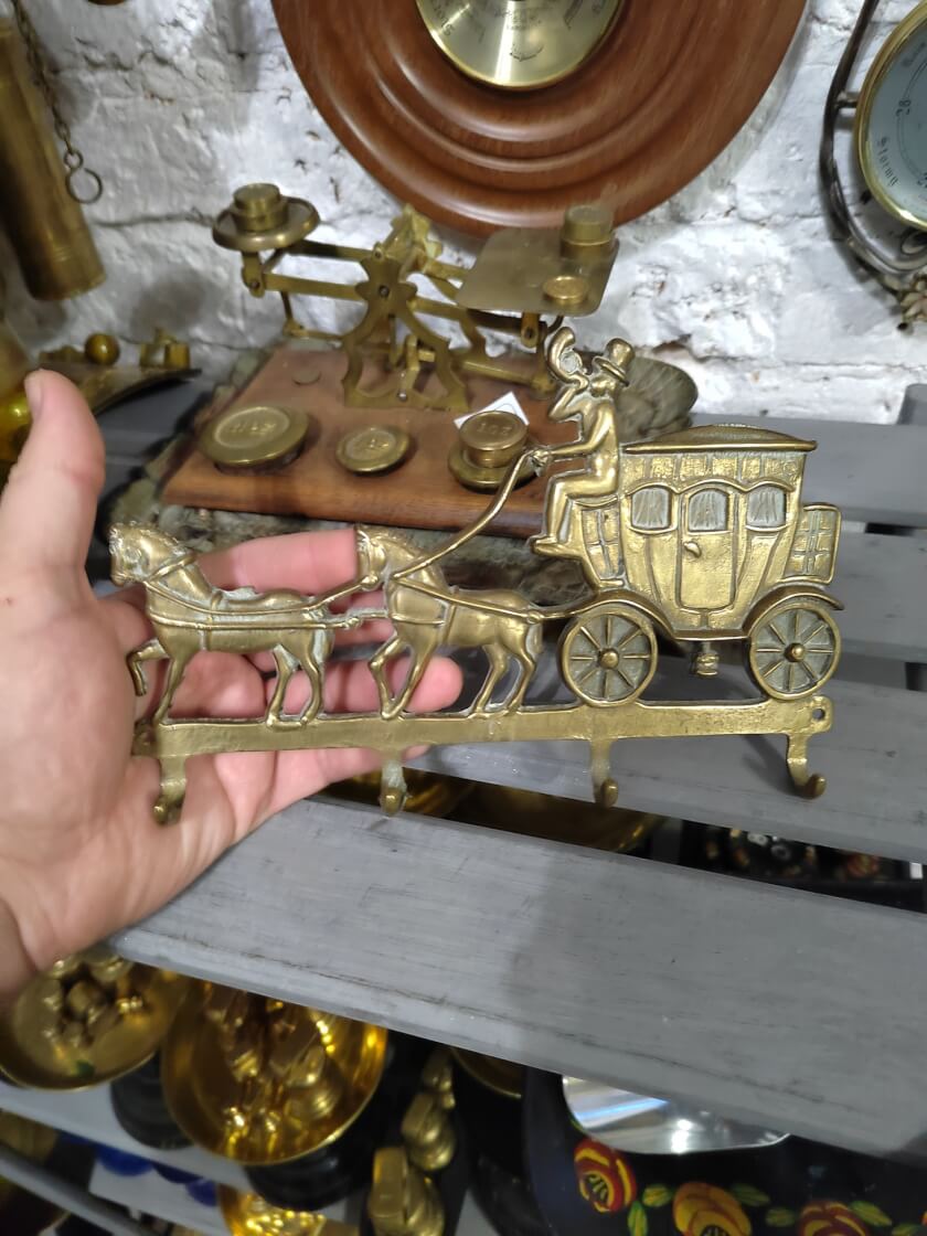 Винтажная вешалка с 4 крючками. Создана в Англии в середине 20 века. Произведена из латуни. Сохранилась в хорошем состоянии. Оформлена в виде Викторианской повозки с запряженными лошадьми. Вешалка прекрасно подойдёт для размещения на входной двери / в прихожей. Может использоваться как ключница, для подвеса мелких вещей, сумок или одежды. Привнесет в интерьер комнаты винтажного лоска и антуража. Все лоты выставлены на нескольких площадках поэтому, пожалуйста, перед покупкой уточняйте наличие.