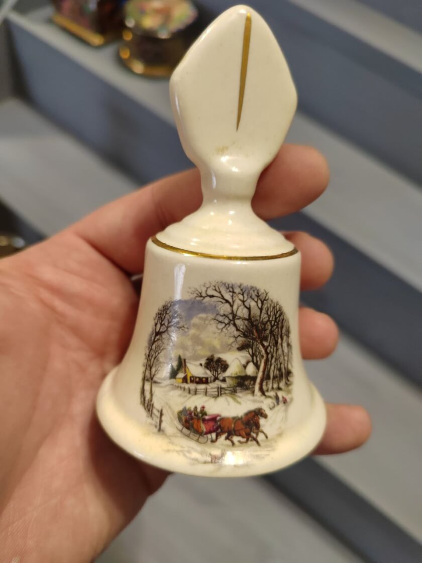 Винтажный колокольчик с рождественским узором деревни и саней. Создан из костяного фарфора. Произведен в середине 20 века. Оформлен позолотой. Звенит. Сохранился в прекрасном состоянии, без сколов и трещин. Станет интересным элементом декора интерьера или частью коллекции. Все лоты выставлены на нескольких площадках поэтому, пожалуйста, перед покупкой уточняйте наличие.