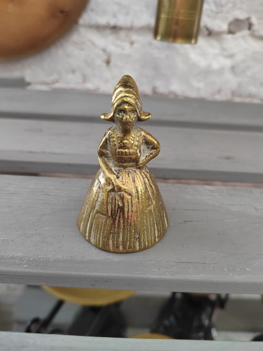 Антикварный коллекционный подзывной колокольчик. Создан в 20 веке в Европе из латуни. Оформлен в виде женщины в чепчике. Сохранился в прекрасном состоянии. Настольный вызывной колокольчик использовался для вызова слуг в домах знати, чтобы хозяйке не приходилось кричать, если что-то понадобится. Был широко распространен в высшем свете. Великолепный, редкий коллекционный экземпляр. Может использоваться по назначению или стать частью коллекции.