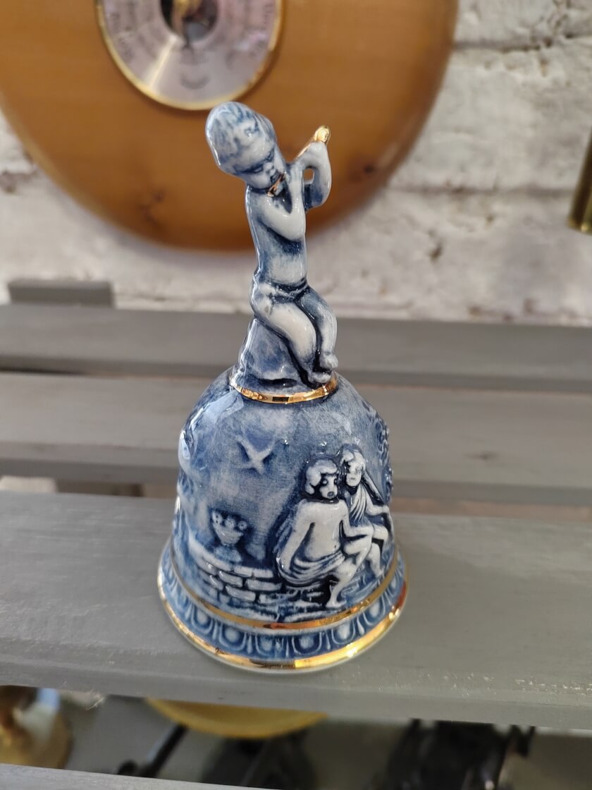 Антикварный коллекционный подзывной колокольчик. Создан в середине 20 века Италии. Произведен в ручную на фарфоровой мануфактуре Каподимонте. Внутри стоит клеймо от производителя. Рукоятка оформлена в виде Херувима, играющего на флейте. Основная часть колокольчика украшена объёмным изображением библейской сцены. Сохранился в прекрасном состоянии. Великолепный, редкий коллекционный экземпляр. Может использоваться по назначению или стать частью коллекции.