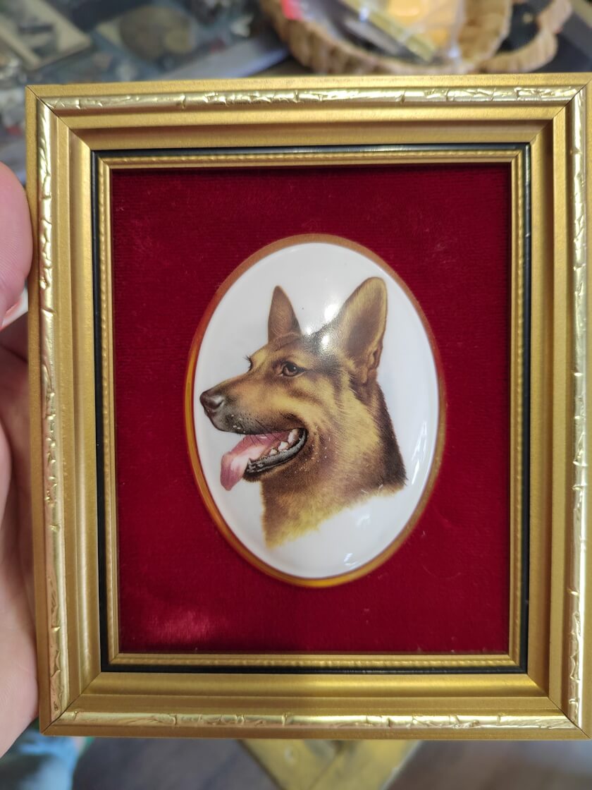 Винтажная декоративная миниатюра с изображением собаки породы Немецкая овчарка. Произведена в середине 20 века в Англии. Изображена на костяном фарфоре. Стоит клеймо от производителя. Оригинальный рисунок нанесён техникой деколь. Миниатюра (медальон) сохранилась в прекрасном состоянии. Обрамлена в позолоченную раму. Станет интересным элементом декора интерьера или частью коллекции. Все лоты выставлены на нескольких площадках поэтому, пожалуйста, перед покупкой уточняйте наличие.