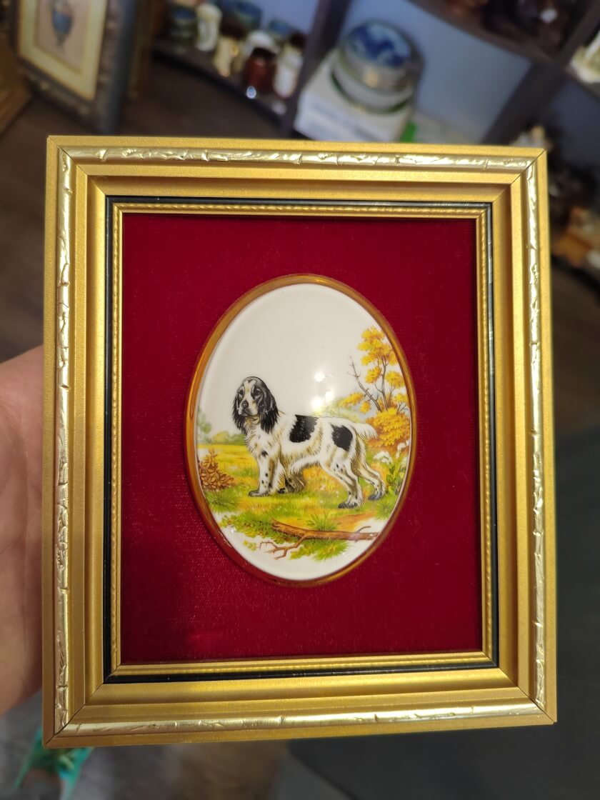 Винтажная декоративная миниатюра с изображением собаки породы Спаниель. Произведена в середине 20 века в Англии. Изображена на костяном фарфоре. Стоит клеймо от производителя. Оригинальный рисунок нанесён техникой деколь. Миниатюра (медальон) сохранилась в прекрасном состоянии. Обрамлена в позолоченную раму. Станет интересным элементом декора интерьера или частью коллекции. Все лоты выставлены на нескольких площадках поэтому, пожалуйста, перед покупкой уточняйте наличие.