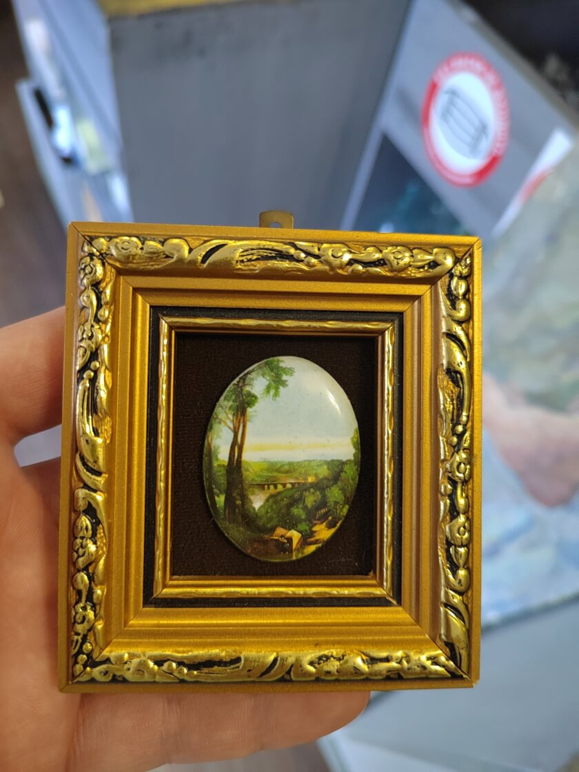 Винтажная декоративная миниатюра с изображением лесного пейзажа. Носит название «127 Whitton Road». Произведена в середине 20 века из костяного фарфора. Создана в Англии на мануфактуре P. G. Collins. Стоит клеймо от производителя. Оригинальный рисунок нанесён техникой деколь. Миниатюра (медальон) сохранилась в прекрасном состоянии. Обрамлена в позолоченную раму. Станет интересным элементом декора интерьера или частью коллекции. Все лоты выставлены на нескольких площадках поэтому, пожалуйста, перед покупкой уточняйте наличие.