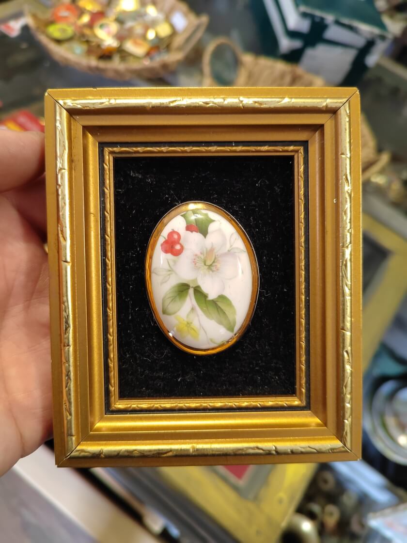 Винтажная декоративная миниатюра с изображением цветов. Произведена из оригинального костяного фарфора. Создана в Стаффордшире, Англия, в середине 20 века. Стоит клеймо от производителя. Оригинальный рисунок нанесён техникой деколь. Миниатюра (медальон) сохранилась в прекрасном состоянии. Обрамлена в позолоченную раму. Станет интересным элементом декора интерьера или частью коллекции. Все лоты выставлены на нескольких площадках поэтому, пожалуйста, перед покупкой уточняйте наличие.