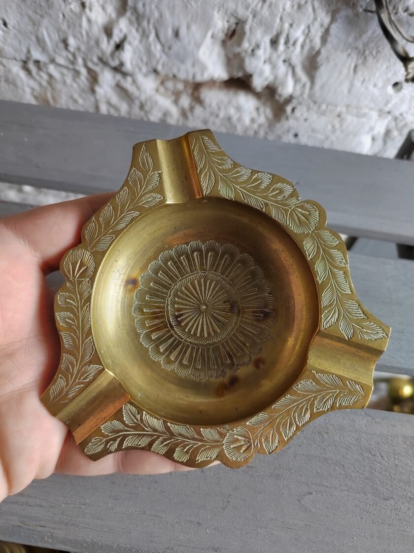 Антикварная настольная пепельница. Произведена в Англии в середине 20 века. Создана из прочной латуни, начищена. Украшена резным лиственным узором по ободку и рисунком крупного цветка в центре. Сохранилась в прекрасном состоянии, может использоваться по назначению. Изящная пепельница с интересным узором прекрасном подойдёт для любого интерьера и станет маленьким винтажным атрибутом в помещении