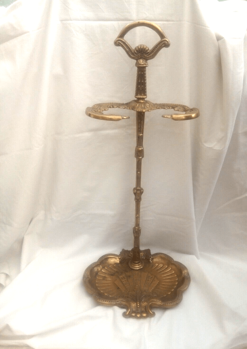 Массивная винтажная подставка для зонтов, трости или каминных принадлежностей. Создана из прочной латуни в первой половине 20 века в Англии. Снабжена верхней широкой ручкой для удобства переноса и использования. По всей длине украшена объёмным узором. Основание оформлено в виде раскрытой ракушки. Устойчивая латунная подставка станет функциональным элементом интерьера прихожей или гостиной комнаты. Может использоваться под каминный или садовый инвентарь, зонтики, трости, ложки для обуви. Высота 72см.