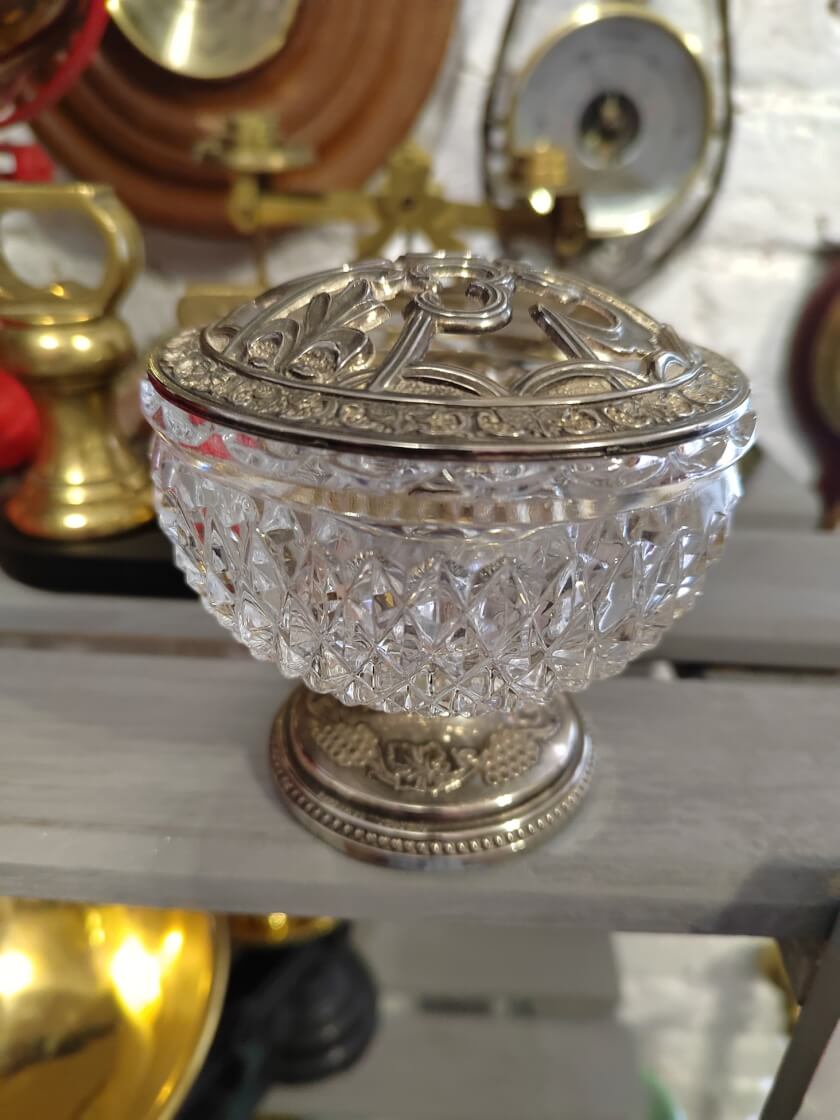 Красивая винтажная ваза с латунной сеткой для цветов. Носит название Роузбоул. Роузбоулы — отдельный вид вазочек, предназначенный для обрезанных бутонов цветов, чаще роз. Бутоны равномерно располагаются по всей решетке и создают вид крупного, пышного букета. Создан во второй половине 20 века из оригинального английского хрусталя. Украшен объёмным узором лозы и винограда по ободку. Латунные части покрыты серебрением. Станет ярким элементом декора комнаты.
