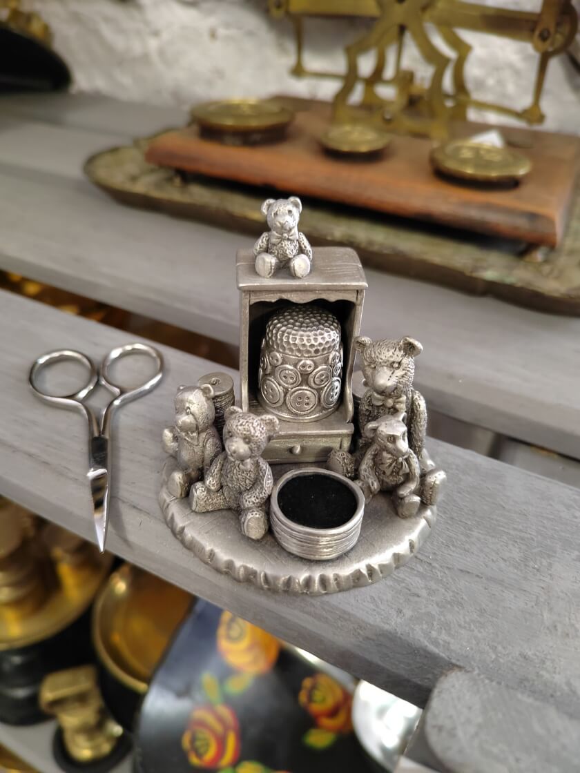 Винтажная швейная станция / швейный набор от английской мануфактуры A. E. Williams. Станция предназначена для хранения швейных принадлежностей: наперстков, ножниц, иголок, булавок. Тонко проработанная швейная станция оформлена в виде игрушечных медвежат. Набор идёт в комплекте с ножницами. Станет прекрасным дополнением туалетного столика / рабочего места швеи или интересным подарком для хозяйки. Все лоты выставлены на нескольких площадках поэтому, пожалуйста, перед покупкой уточняйте наличие.