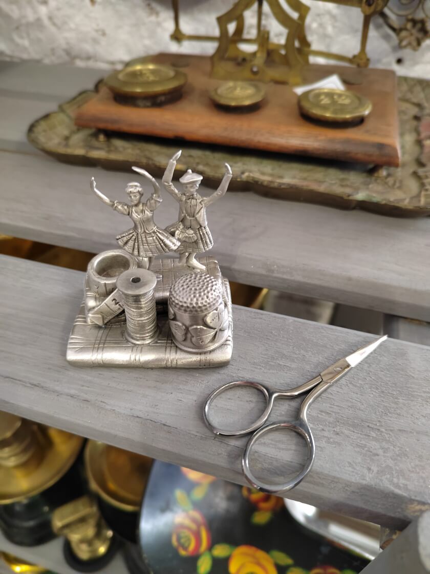 Винтажная швейная станция / швейный набор от английской мануфактуры A. E. Williams. Станция предназначена для хранения швейных принадлежностей: наперстков, ножниц, иголок, булавок. Тонко проработанная швейная станция оформлена в виде пары танцоров. Набор идёт в комплекте с ножницами. Станет прекрасным дополнением туалетного столика / рабочего места швеи или интересным подарком для хозяйки. Все лоты выставлены на нескольких площадках поэтому, пожалуйста, перед покупкой уточняйте наличие.